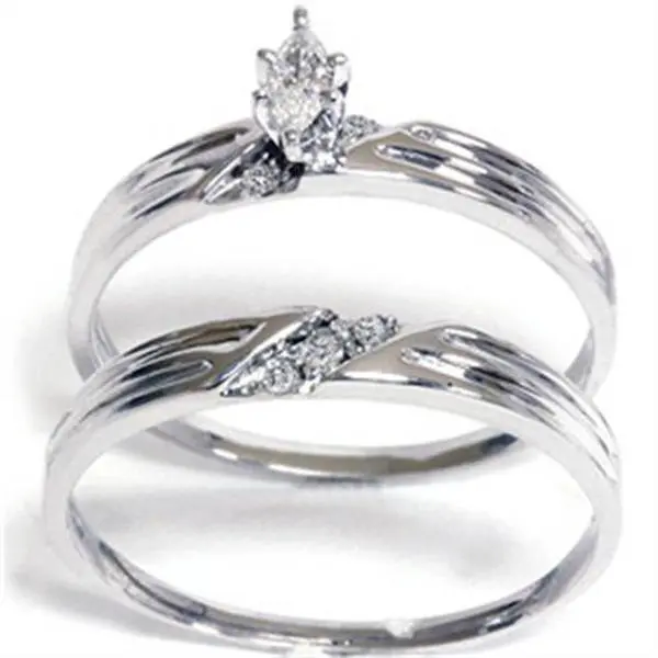 This classic women's engagement ring set features a marquise center stone and round brilliant cut accent stones. All diamonds are set in solid 14k white gold. .25ct total diamond weight.
