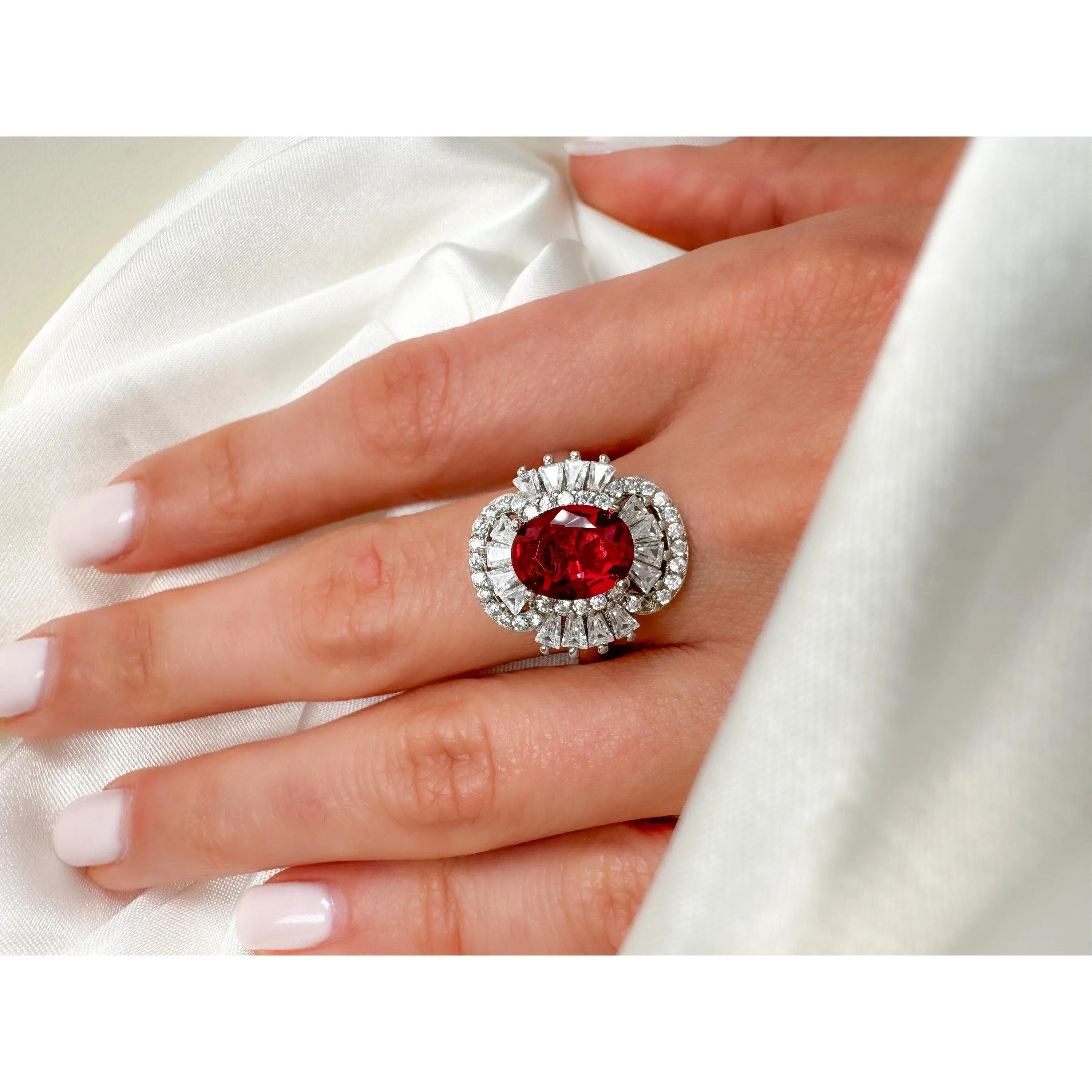 2 Ct Oval Cut Ruby Statement Silver Ring, Size 8.25