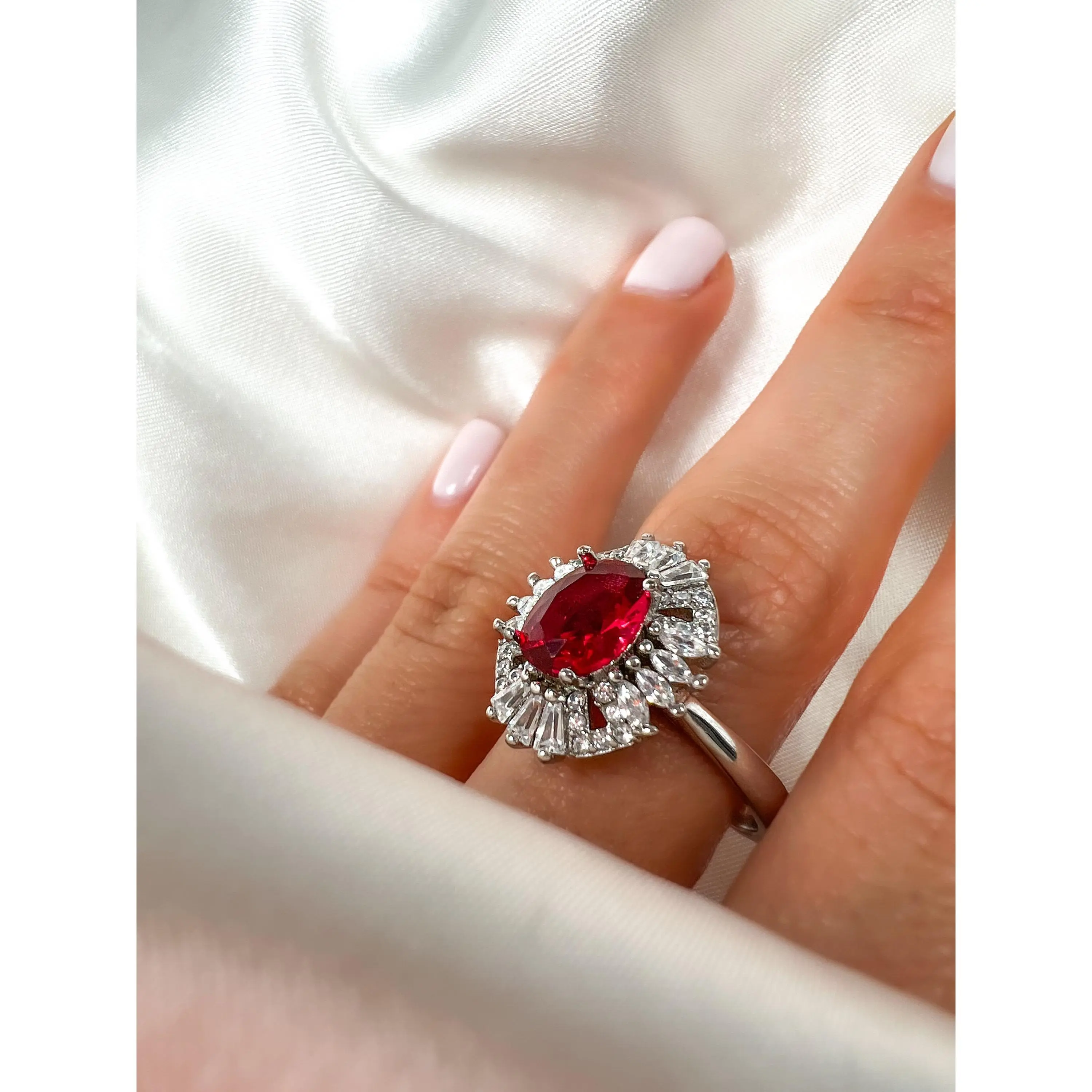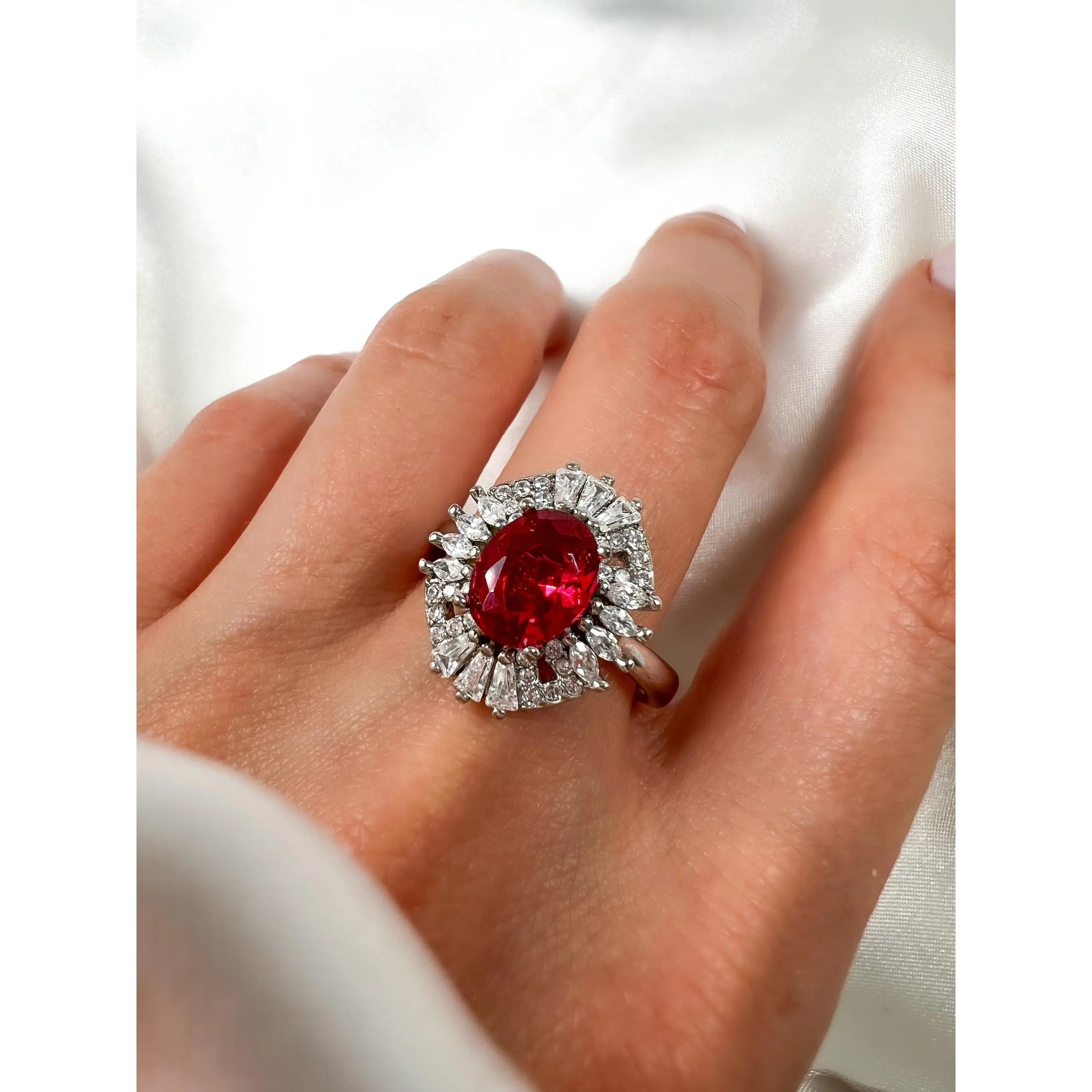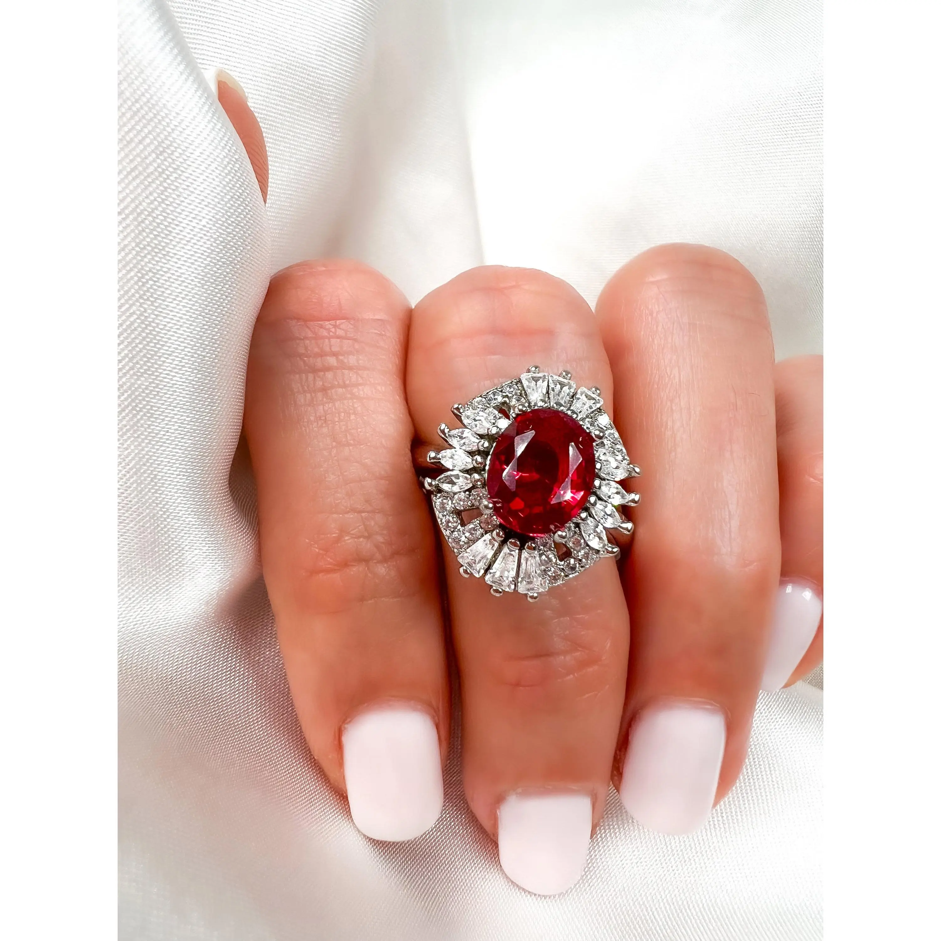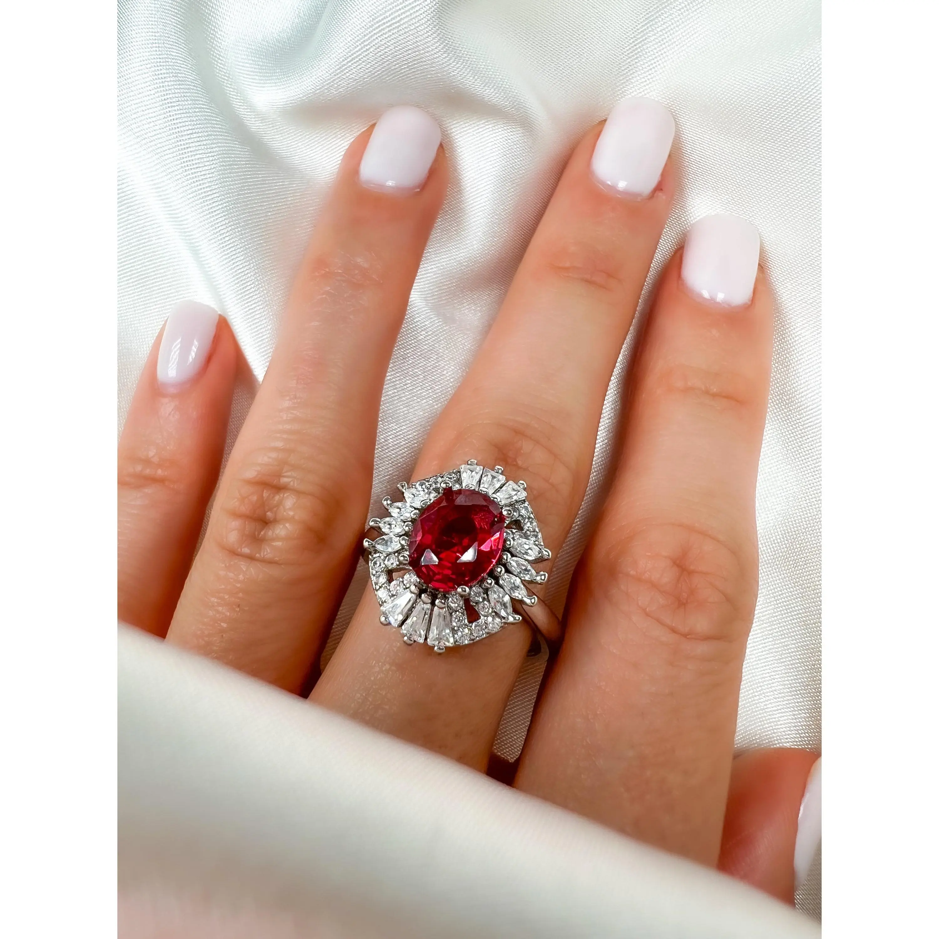 "2CT OVAL CUT RUBY HALO STERLING SILVER RING"◆ MATERIAL:Solid 925 Sterling SilverRhodium plated Over 925 Sterling Silver ►Ring Size : 8.25 US ◆ SETTING:Prong Setting ◆ GEMSTONE: ✦Simulated Ruby:► Cut: Oval Cut► Center Stone Dimension: 9mm x 7mm► Approximate Center Stone Carat weight: 2Ct✦Simulated Diamond:► Flawless D Color► AAAA Quality► 100% Eye Clean Gemstone► Excellent CutThis handmade piece is crafted with the perfect alternative Gemstones.Our Stones are cut and faceted to the highest quality standards to achieve maximum brilliance.The eye-catching sparkle of this piece is absolutely breathtaking.*Please ask any questions you may have*