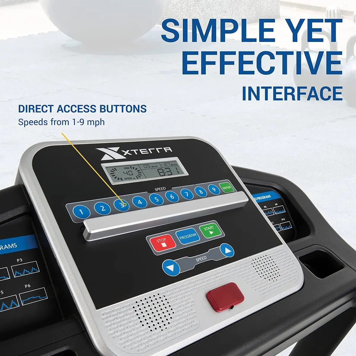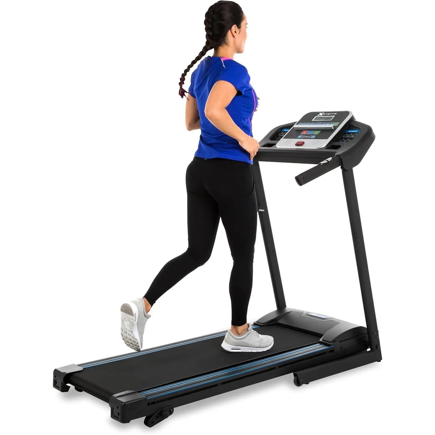 XTERRA Fitness provides everything you require to reach your fitness goals in the TR folding treadmill. Offering a wide variety of workout programs, you can now realize your health and conditioning ambitions. Thanks to its sturdy frame and powerful motor, the TR150 and TR260 treadmills are built to keep up for as far as you can push yourself. The widescreen LCD display enables you to easily monitor information such as your pulse, speed, distance, time, and calories burned. Hand pulse sensors are conveniently mounted on the handlebars to keep you in your training zone. XTRASOFT deck cushioning technology provides maximum impact absorption, minimizing the stress on your joints and providing a more comfortable workout. Accessory holders are integrated into the console to conveniently hold your phone, water bottle, remote control, and more. When your workout is complete simply fold up the deck and move it out of the way with built-in transport wheels for easy storage.