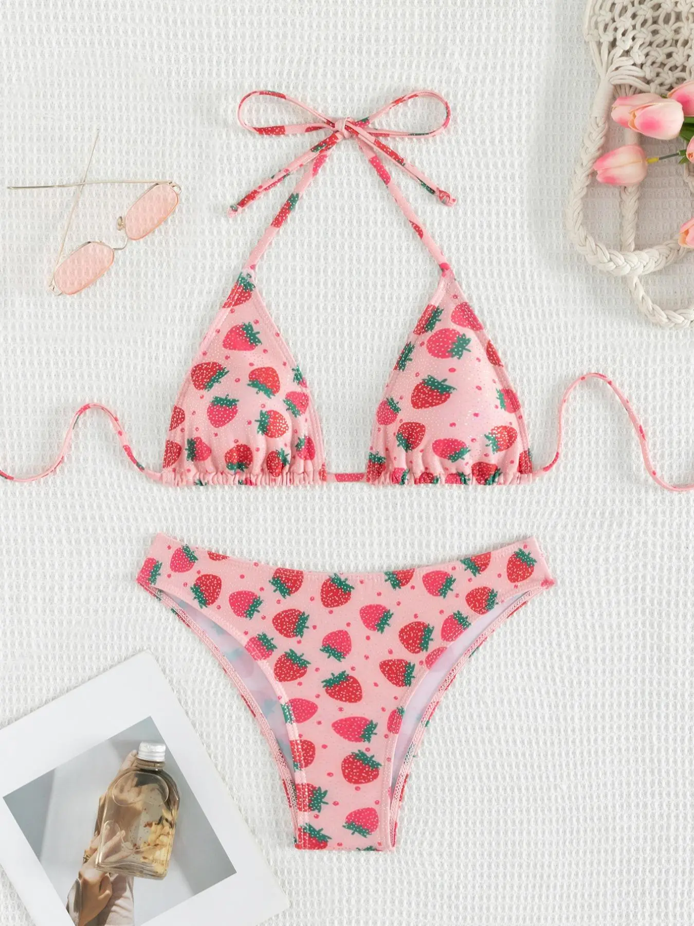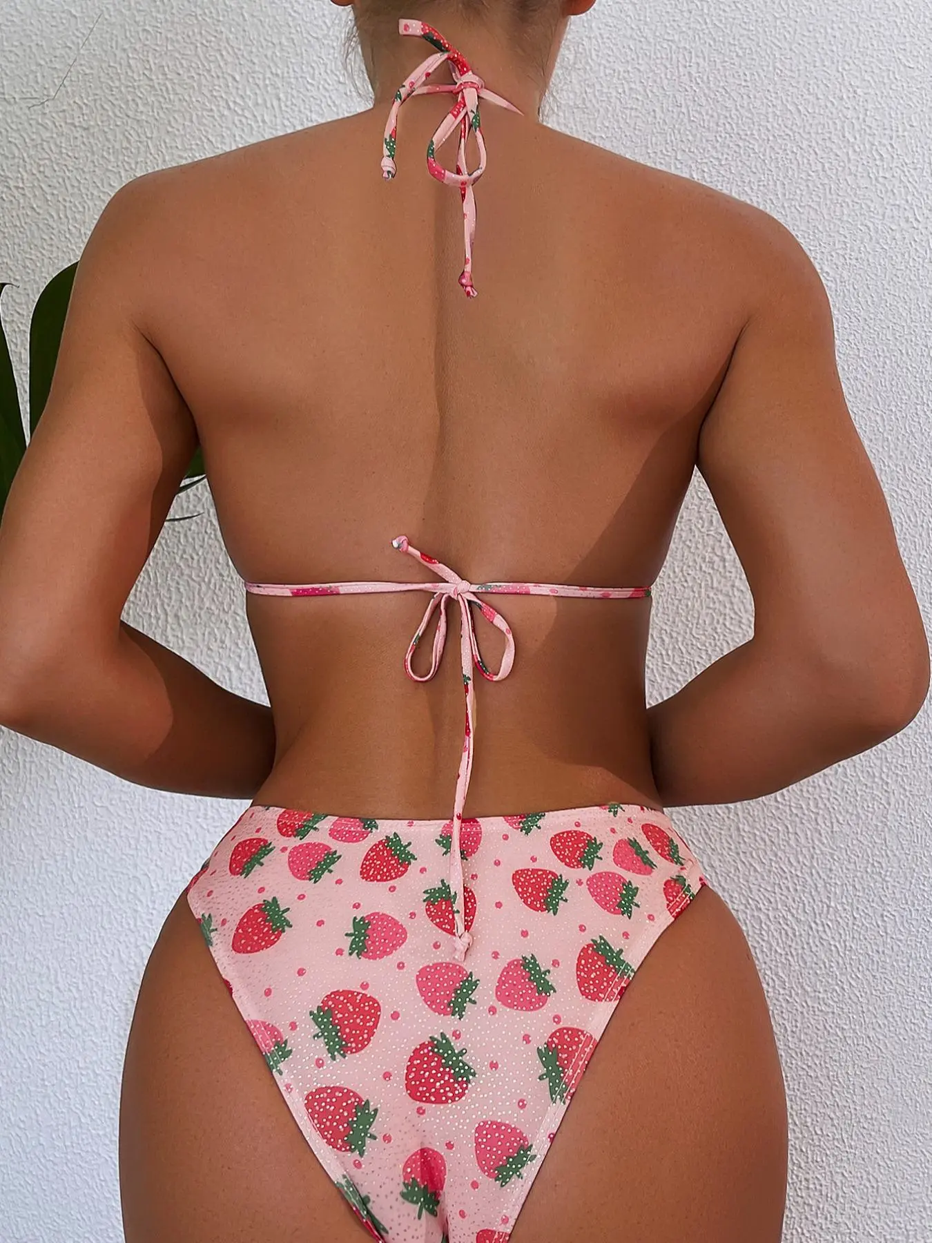 Women's Strawberry Print Halter Neck Tie Back Triangle Swim Bra & High Cut Swim Panty Bikini Set, Casual Fruit Print Backless Swimwear Set, Ladies Summer Swimsuit for Beach Holiday Vacation, Bikinis Sets