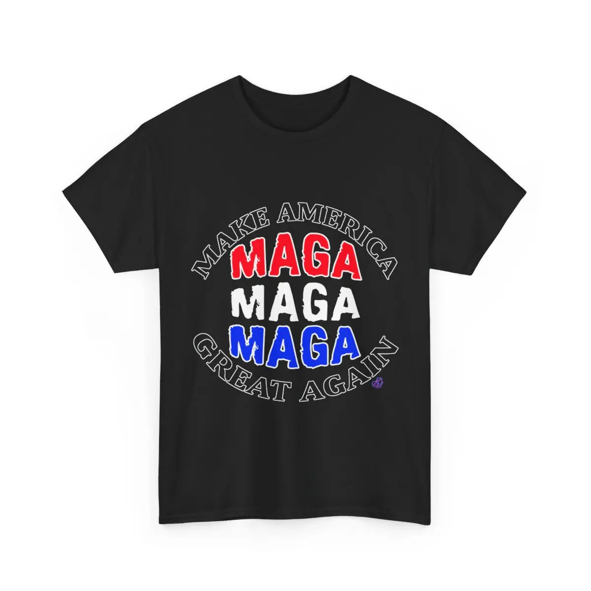 MAGA 3X; in RED, WHITE and BLUE. MAKE AMERICA GREAT AGAIN GOING AROUND IT. Throw Back Tee.