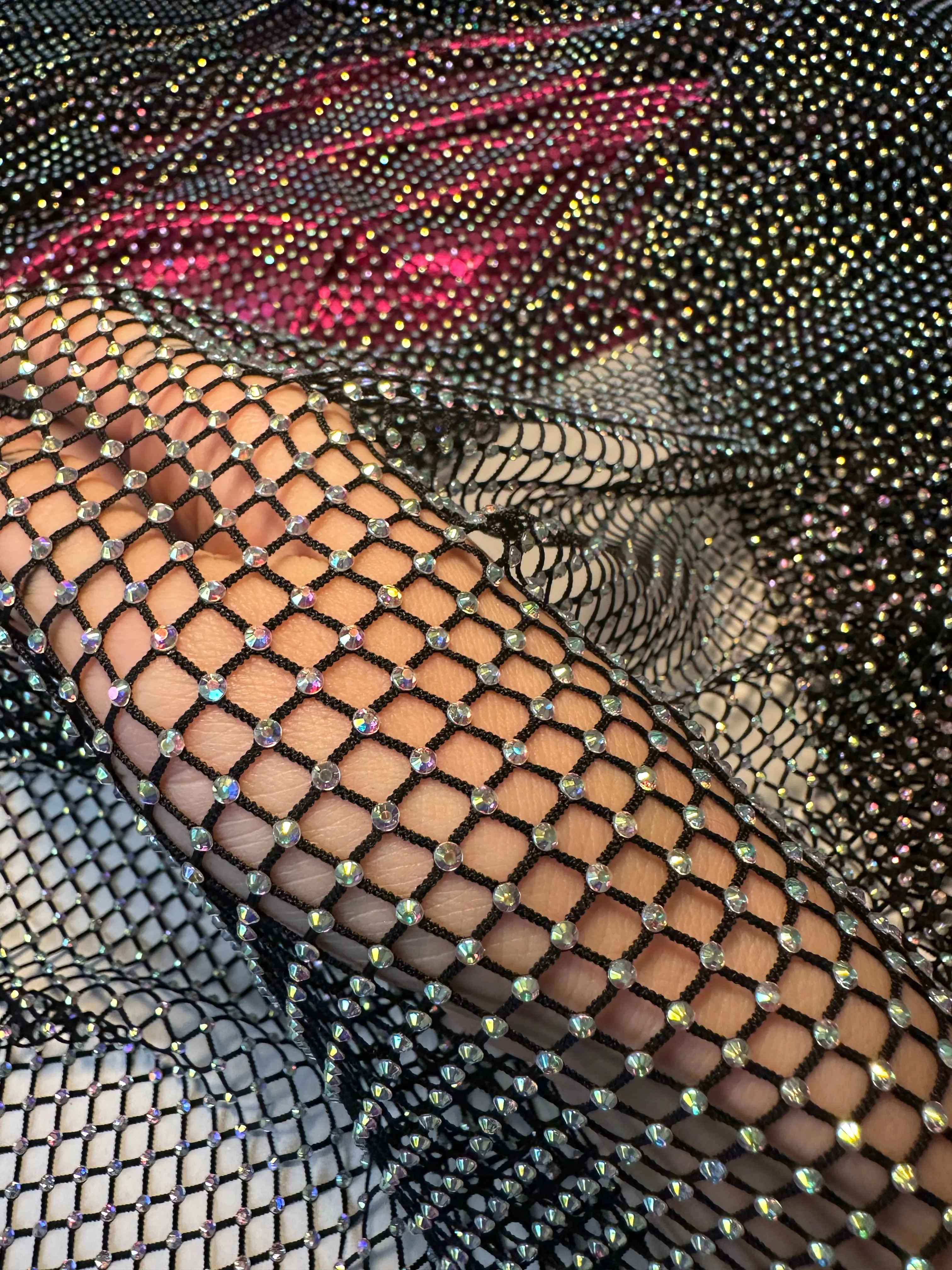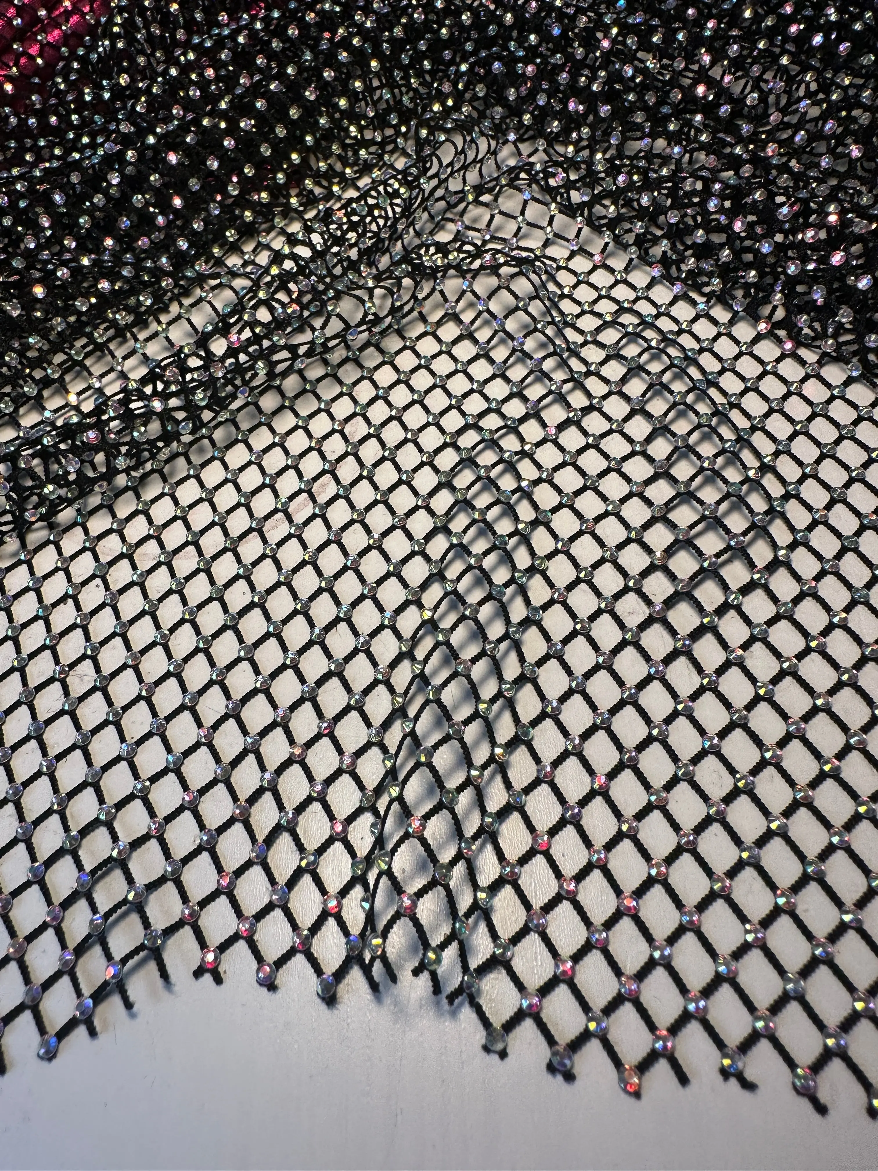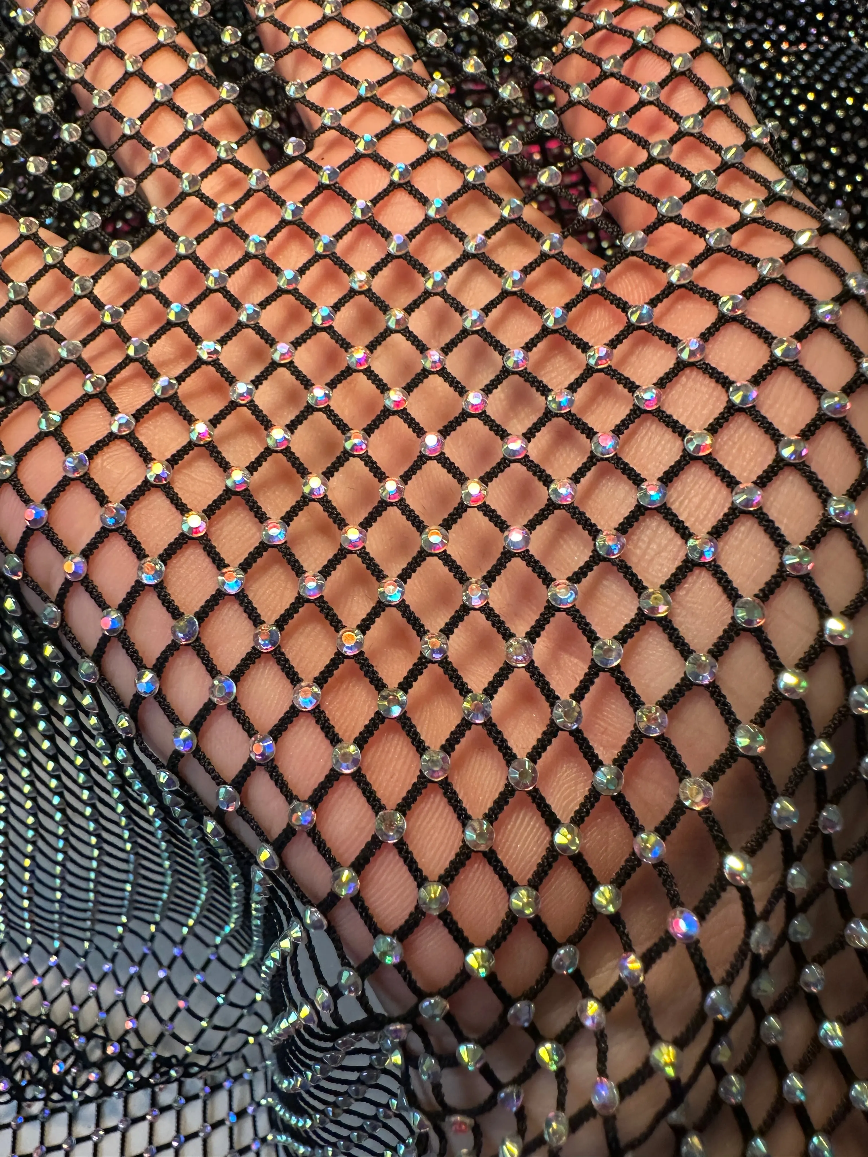 Completely captivating and of an excellent quality, Kiki Textiles presents the Black Rhinestone Mesh. With it's luminescent and iridescent rhinestone beading, this fishnet fabric is of a light to medium weight and consists of a very textured surface. Ideas for such a detailed fabric may include overlays for brilliant gowns and evening jackets. It can also be used for neck panels and back panels on a high-end, detailed garments. This mesh features a 6% stretch in all directions.