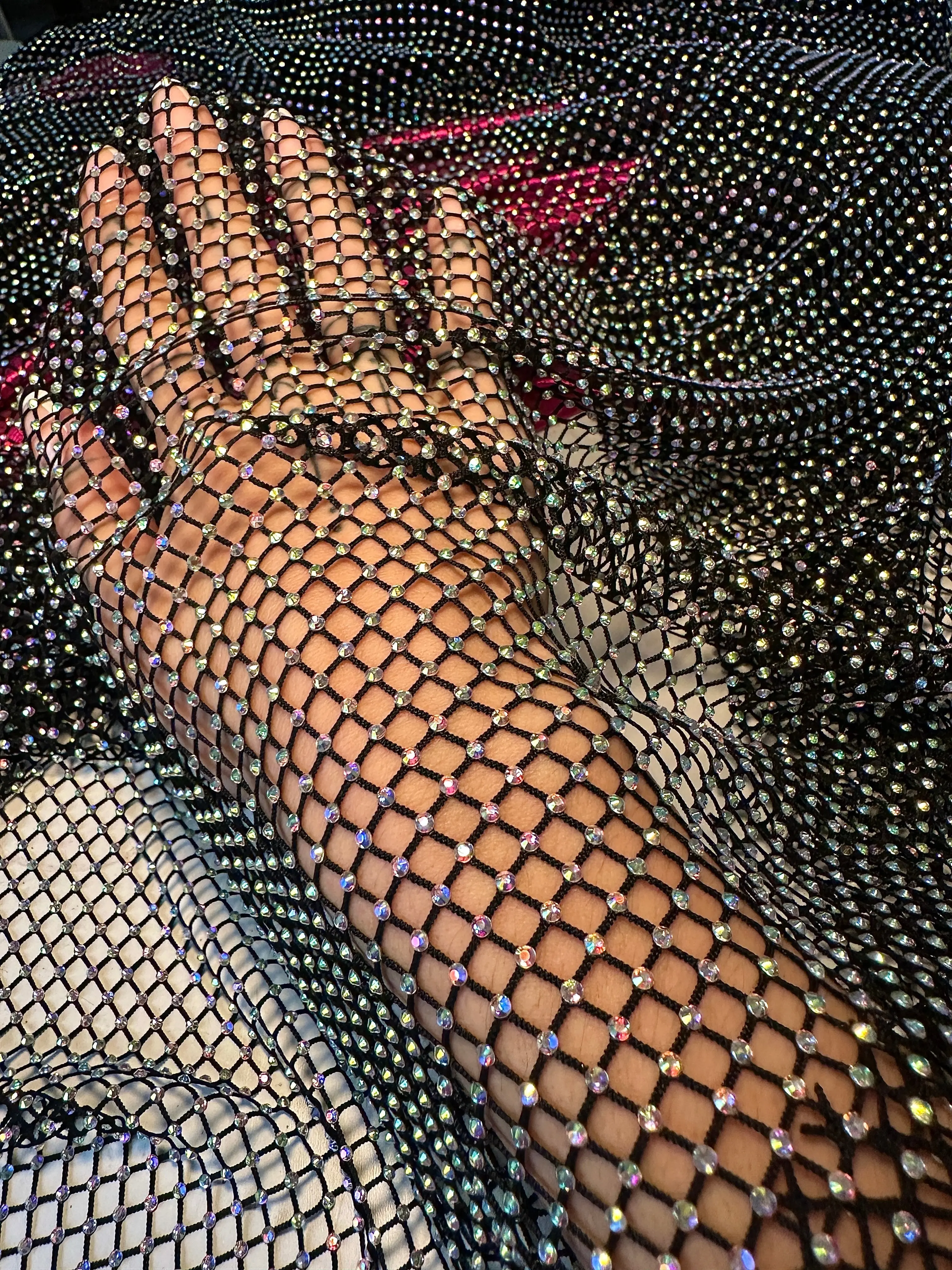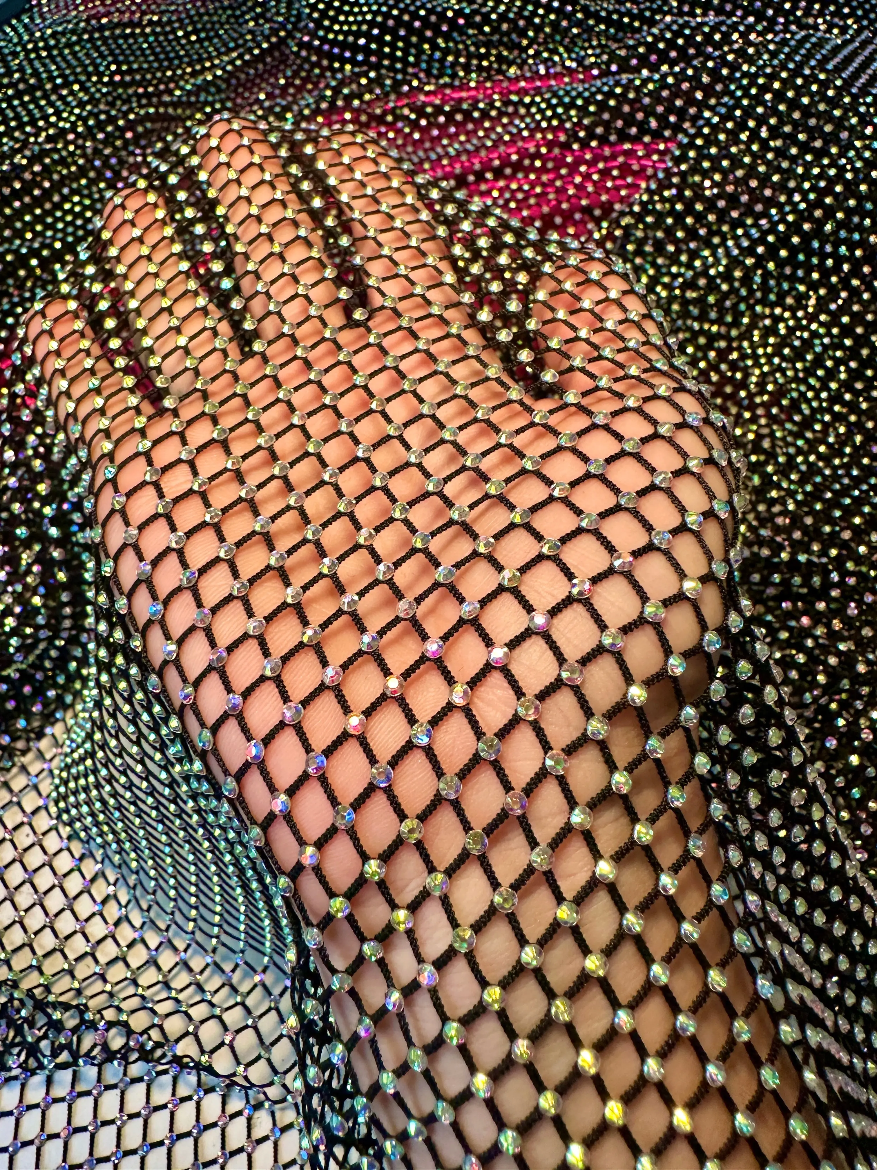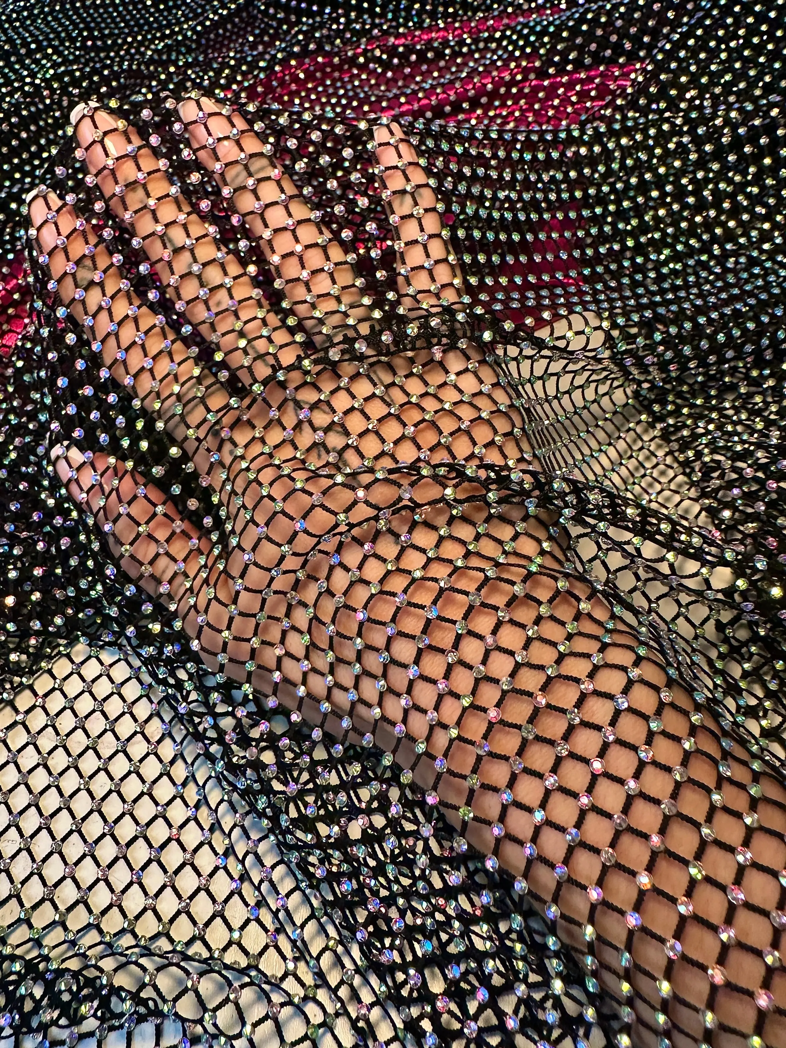 Completely captivating and of an excellent quality, Kiki Textiles presents the Black Rhinestone Mesh. With it's luminescent and iridescent rhinestone beading, this fishnet fabric is of a light to medium weight and consists of a very textured surface. Ideas for such a detailed fabric may include overlays for brilliant gowns and evening jackets. It can also be used for neck panels and back panels on a high-end, detailed garments. This mesh features a 6% stretch in all directions.