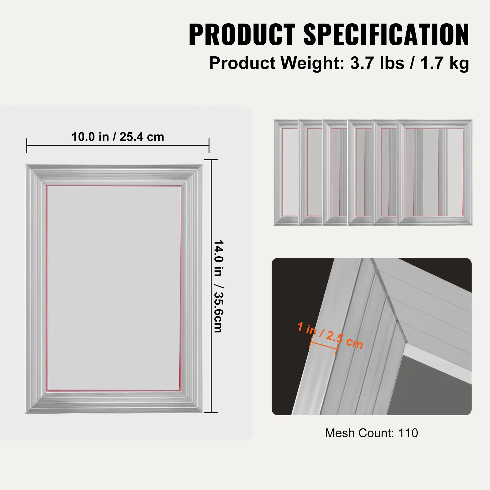 • Streamlined Printing: Take your screen printing to the next level with our silk screen frame kit! Featuring 6 pieces of 110 mesh aluminum alloy screen printing plates and a 10x14 inch screen size, you'll have everything you need to create stunning prints with ease With this kit, you can rest assured that your creativity will have no limits.