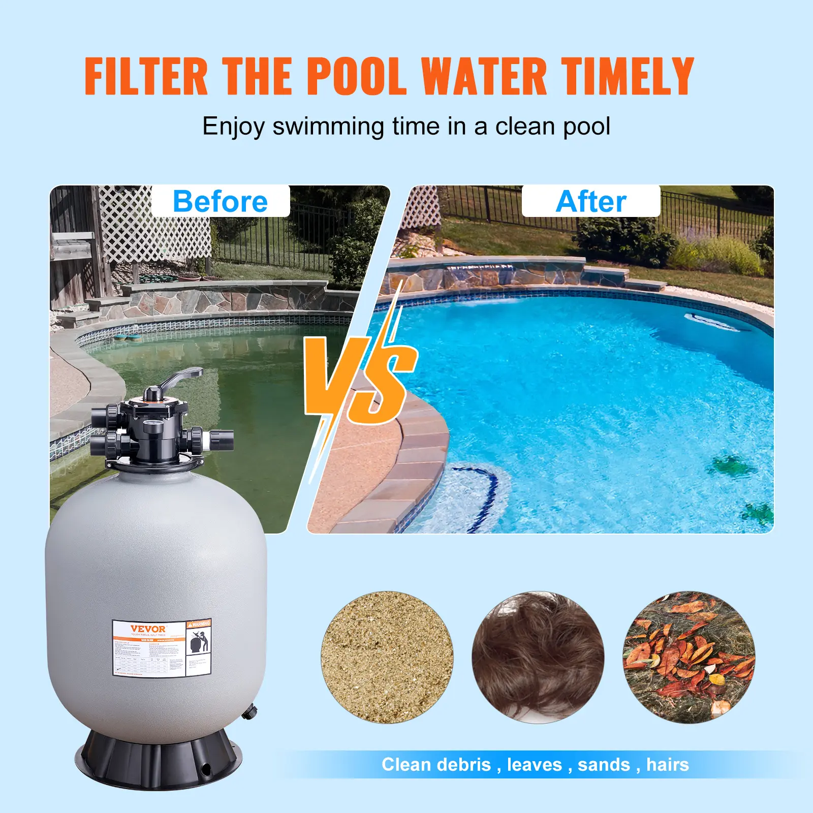 • Meet All Your Pool Needs: Whether you're installing it at home or for your business, VEVOR is a name you can trust. Our swimming pool sand filter is versatile and suitable for various above-ground and in-ground pools, including courtyard pools, indoor villa pools, gym pools, and hotel pools.