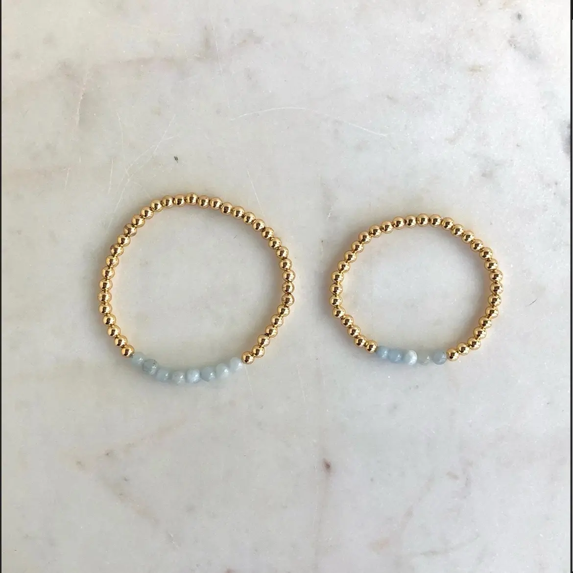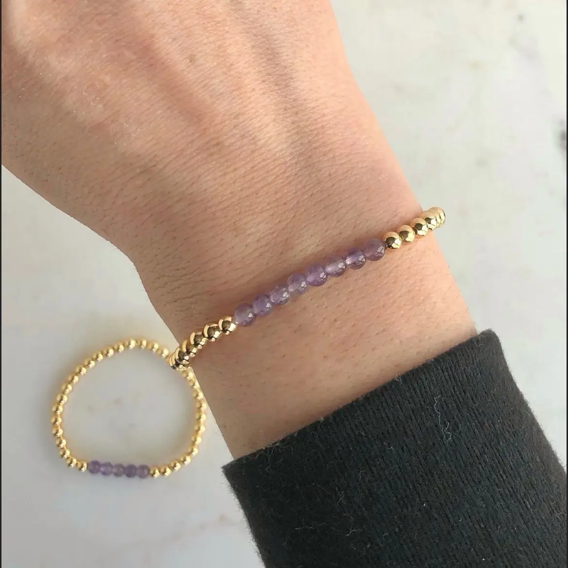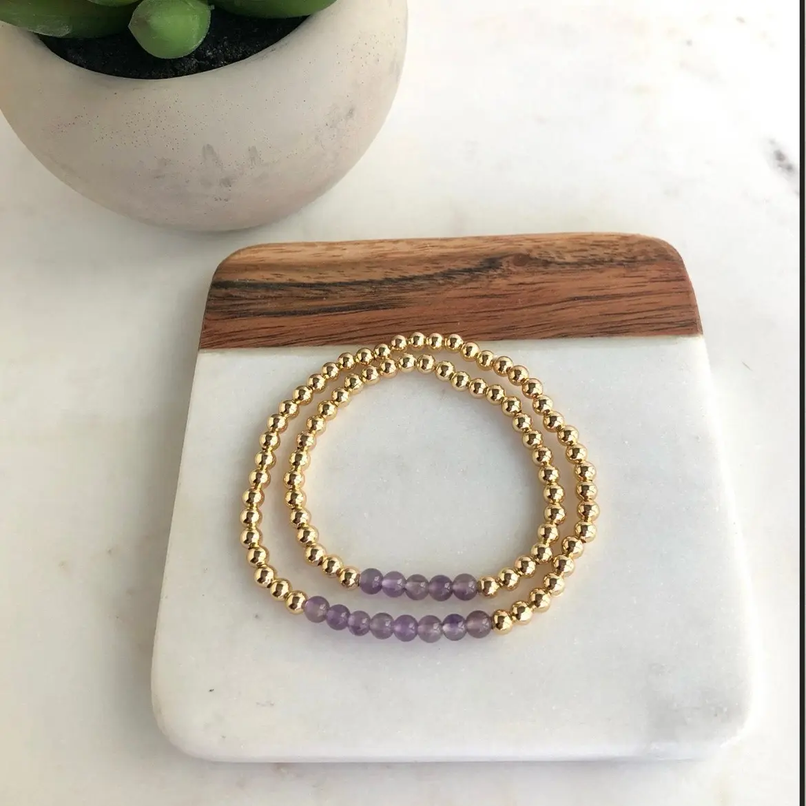 These delicate gold beaded bracelets are made with 18k gold plated, 24k gold filled, rose gold or sterling silver plated 4mm beads and your choice of rose quartz (pink), aquamarine (greenish) or amethyst (purple) gemstone beads strung together with a strong elastic cord. Gold filled beads have a thicker layer of gold and will last for years.