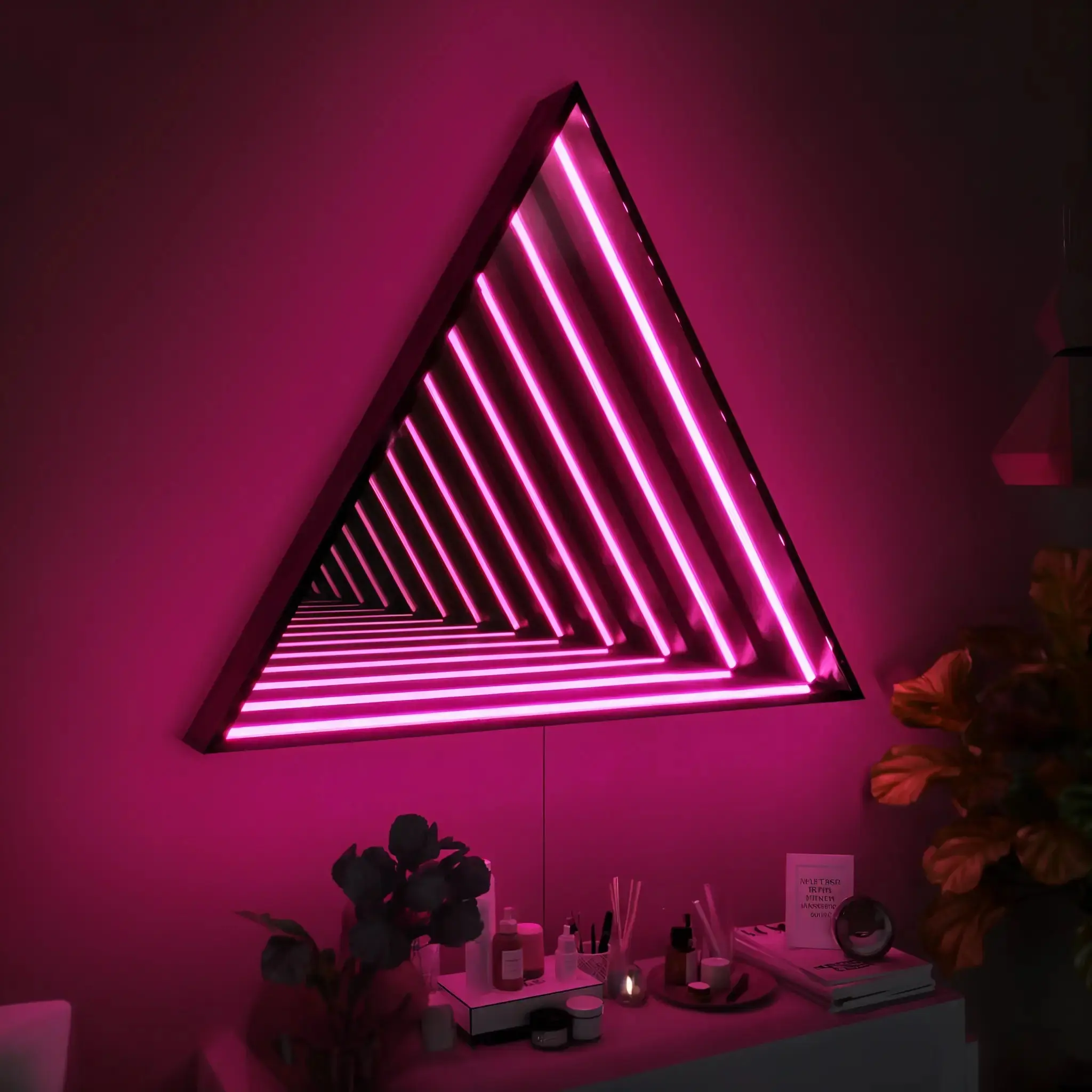 Introducing our Triangle Infinity Mirror: a mesmerizing fusion of mirrors and LED lights. Crafted with precision, this 3D masterpiece features an open design, allowing LED lights within the sleek frame to dance endlessly, drawing viewers into an enchanting journey of reflection and light. Perfect for adding depth and intrigue to any space, it's not just a mirror but a gateway to endless fascination. Elevate your decor with this captivating blend of form and function.