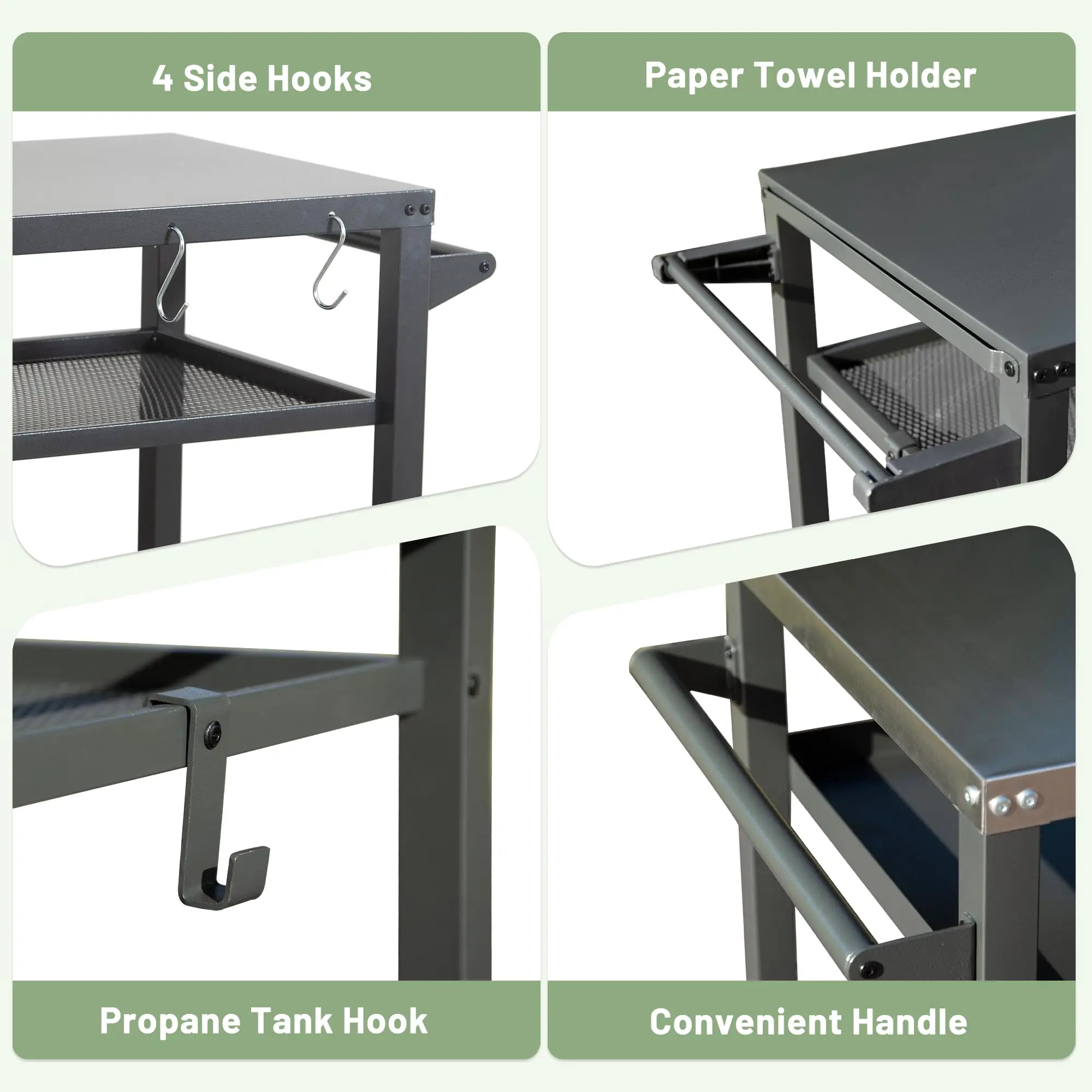 ·Full & Useful Accessories- The food prep cart table includes paper towel holder, paper tissue holder, propane tank hook, bottle opener, 4 multi-functional tool hooks, etc, organizing all your favourite utensils for different cooking propose.