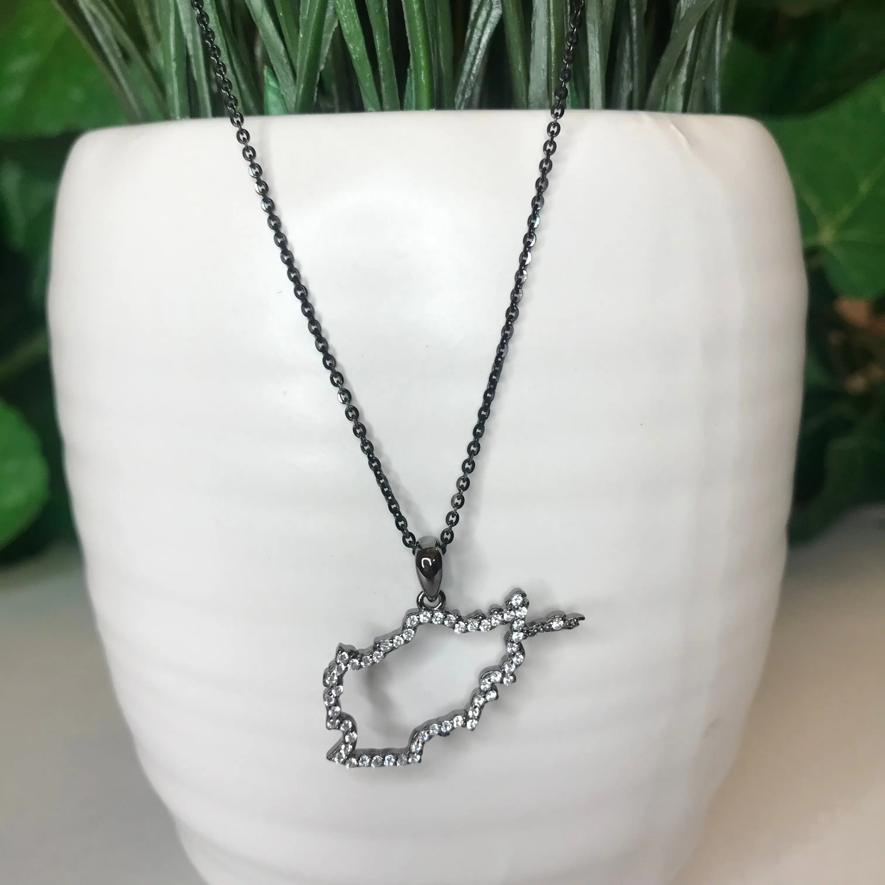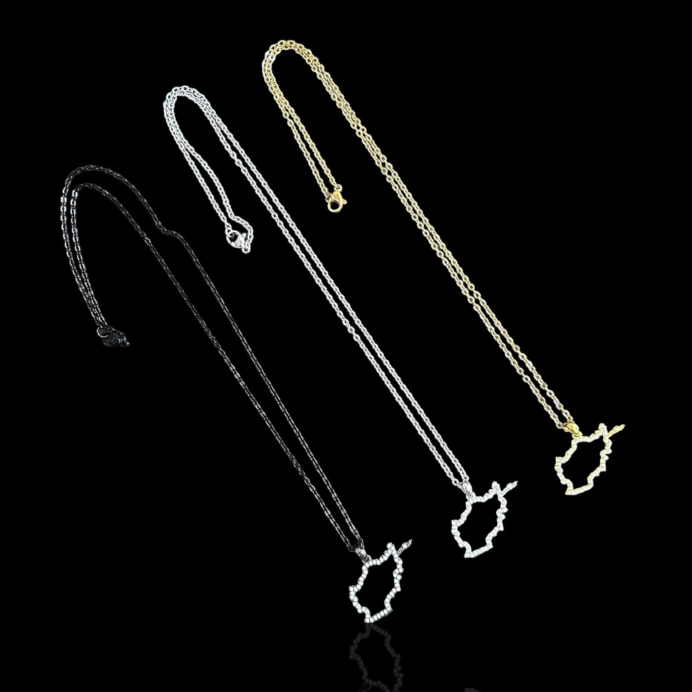 Available in Black, Gold or Silver. This beautiful Map Necklace is made from Sterling Silver and coated in your choice of Rhodium, Gold, or Black Rhodium. This coating prevents damage or tarnish to the necklace.