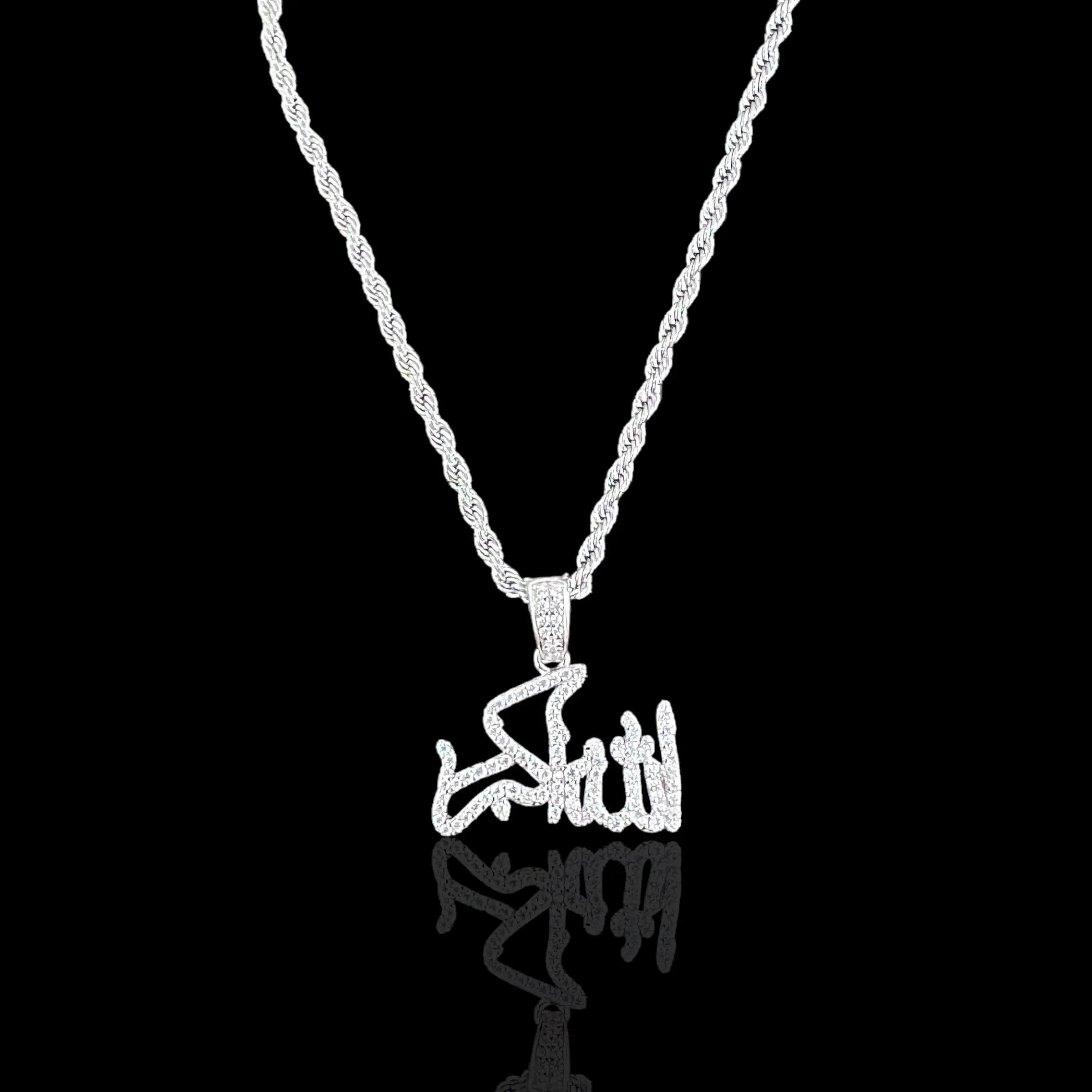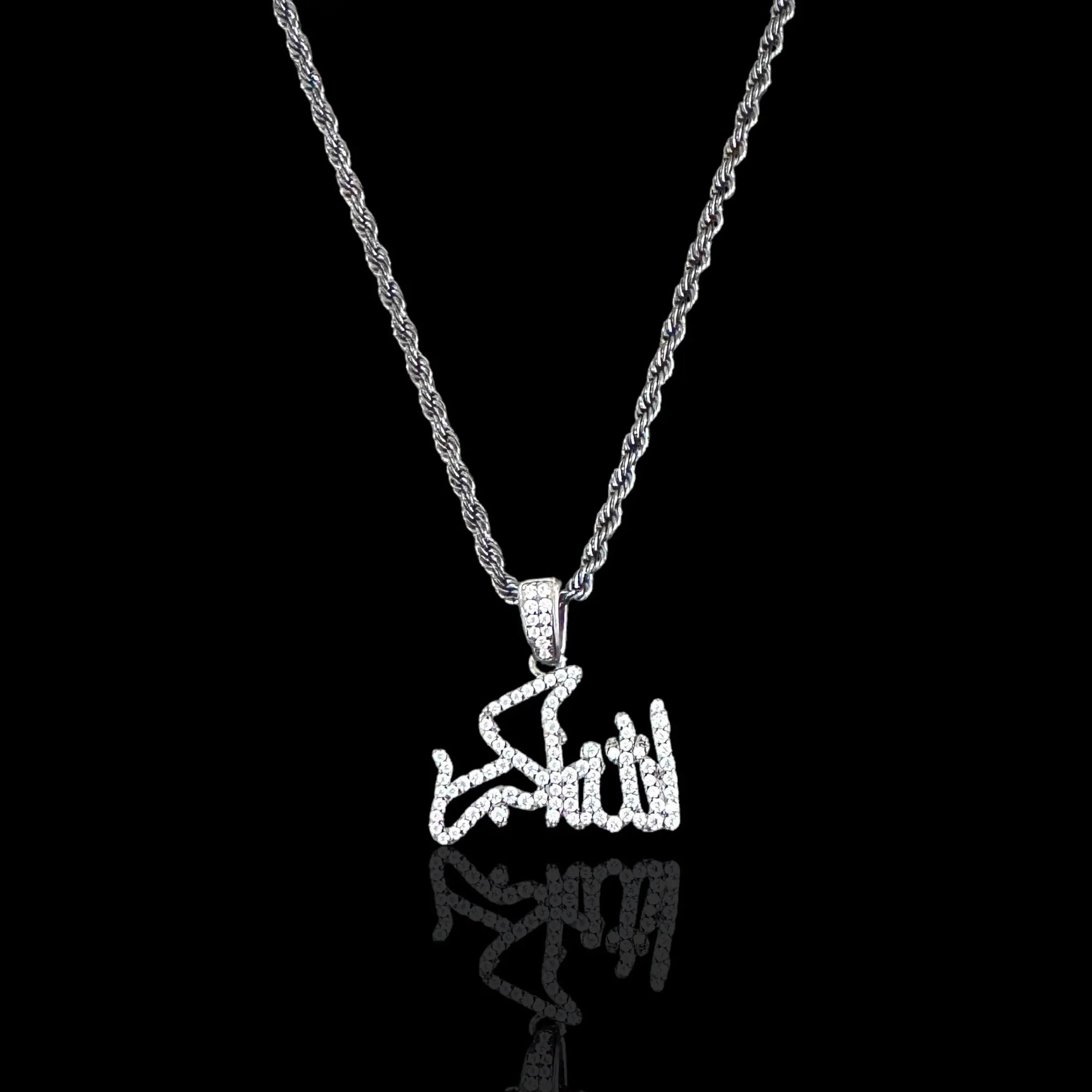 Sterling Silver CZ Allahu Akbar Pendant Necklace. The Arabic phrase "Allahu Akbar" translates to "Allah (God) is the Greatest." It is a powerful declaration of faith and gratitude to Allah.