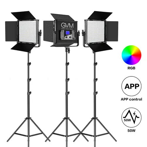 GVM has put together this 50RS RGB LED Panel 3-Light Kit to give image makers on location the benefit of a system with wide color and light quality control, as well as power options. The kit includes three 50RS RGB LED panels, each with 4-way barn doors, an A-frame diffuser, an AC adapter, and cable, a light stand, and a carry case.