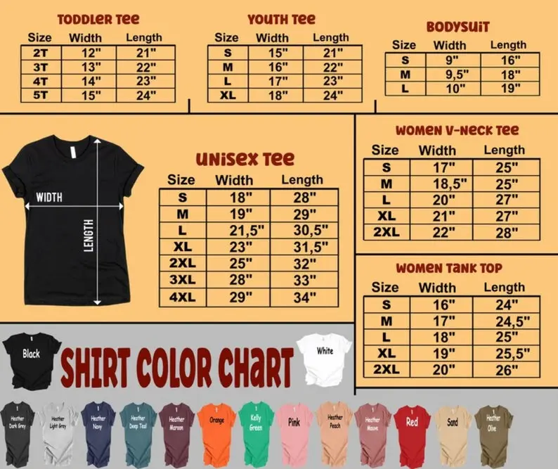 * Please check all color and size charts before place the order. Since all shirts are custom made based on your selection, I don’t accept return or exchange unless there is an issue with your order.
