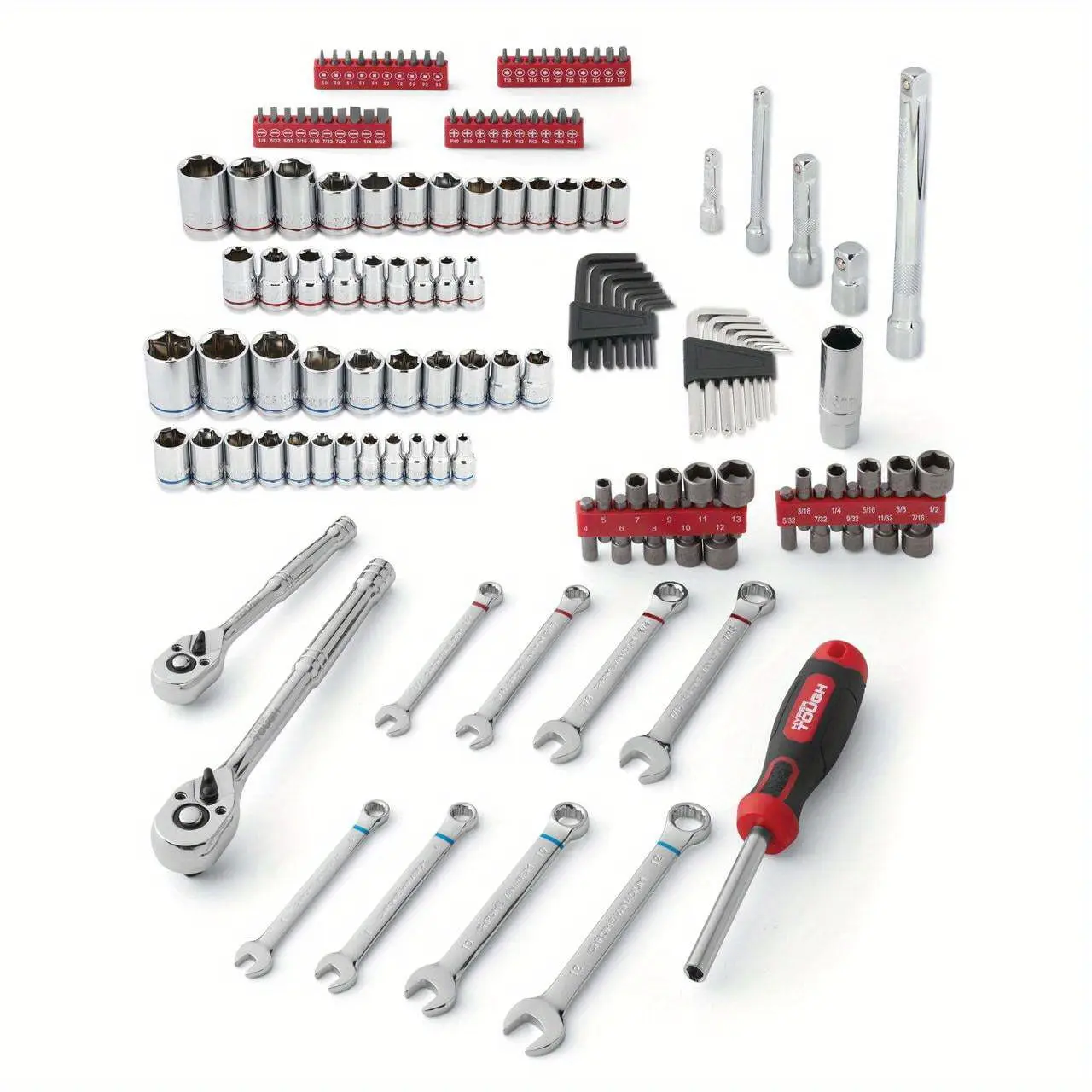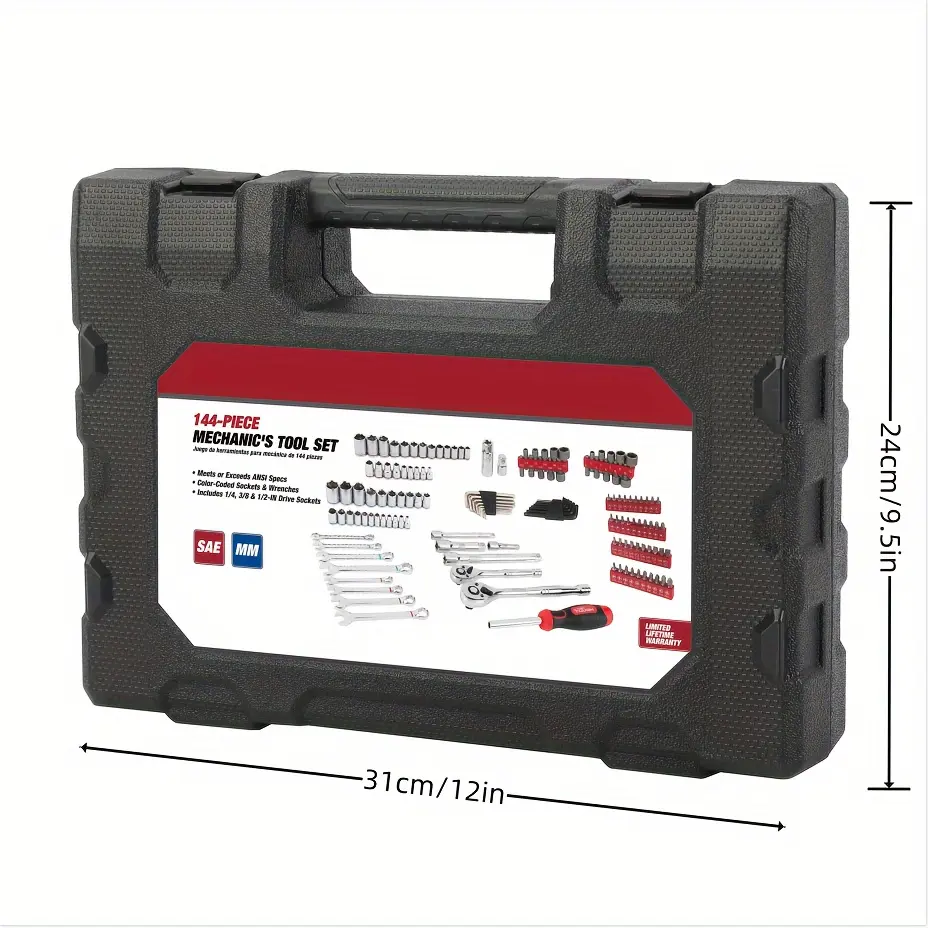 Equip yourself for any task with the 144-Piece Mechanics Tool Set. Whether you're an experienced mechanic or a passionate DIYer, this all-inclusive set contains all the necessary tools. Featuring a range of sockets and wrenches in metric and SAE sizes, color-coded for convenience, you'll be able to tackle any project effortlessly. Designed to meet or surpass ANSI standards, these tools are constructed for robustness and longevity. Neatly arranged in a durable molded case, all components are easy to store and carry. Enhance your toolkit now.
