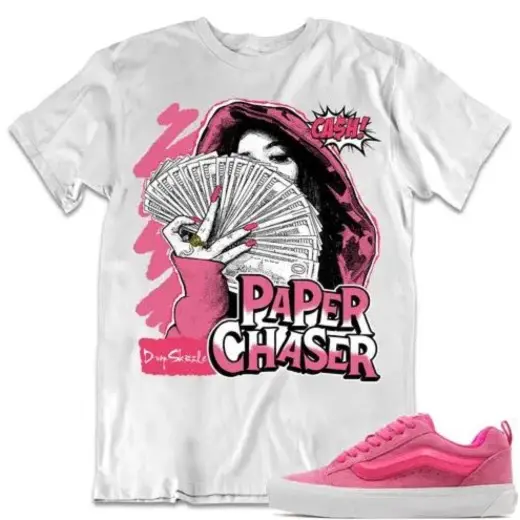 This shirt is a perfect match for Vans Skool Pink dropSkizzle shoes. It is a T-Shirt with a paper chaser design that is sure to catch the eye of anyone who sees it. The shirt is made of a comfortable and breathable material that is perfect for everyday wear. It is available in a range of sizes to ensure that everyone can find the perfect fit.