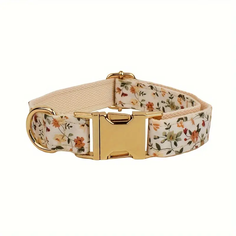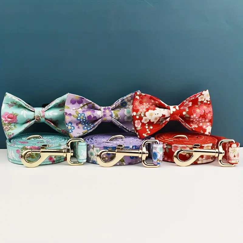 Small Flower Blue Dog Collar + Dog Leash + Bow