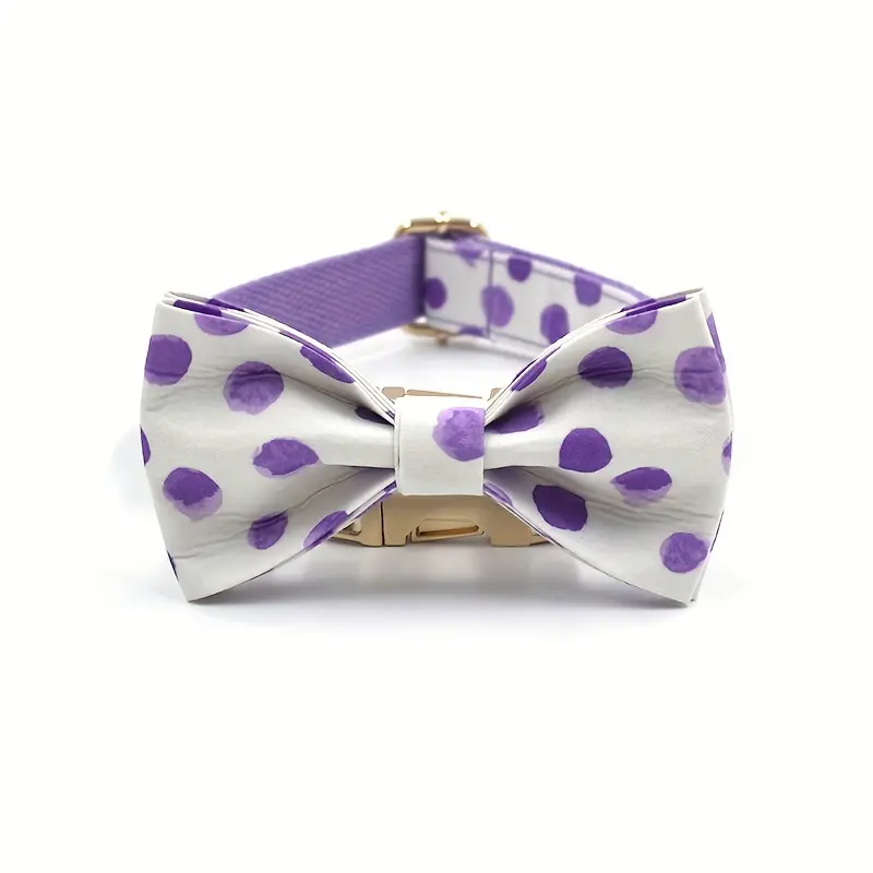 [Personalized] 3 pcs/set light purple polka dot adjustable pet dog collar leash bow tie set,free laser engraved dog's name,owner's phone number,wedding gift for dogs Customized