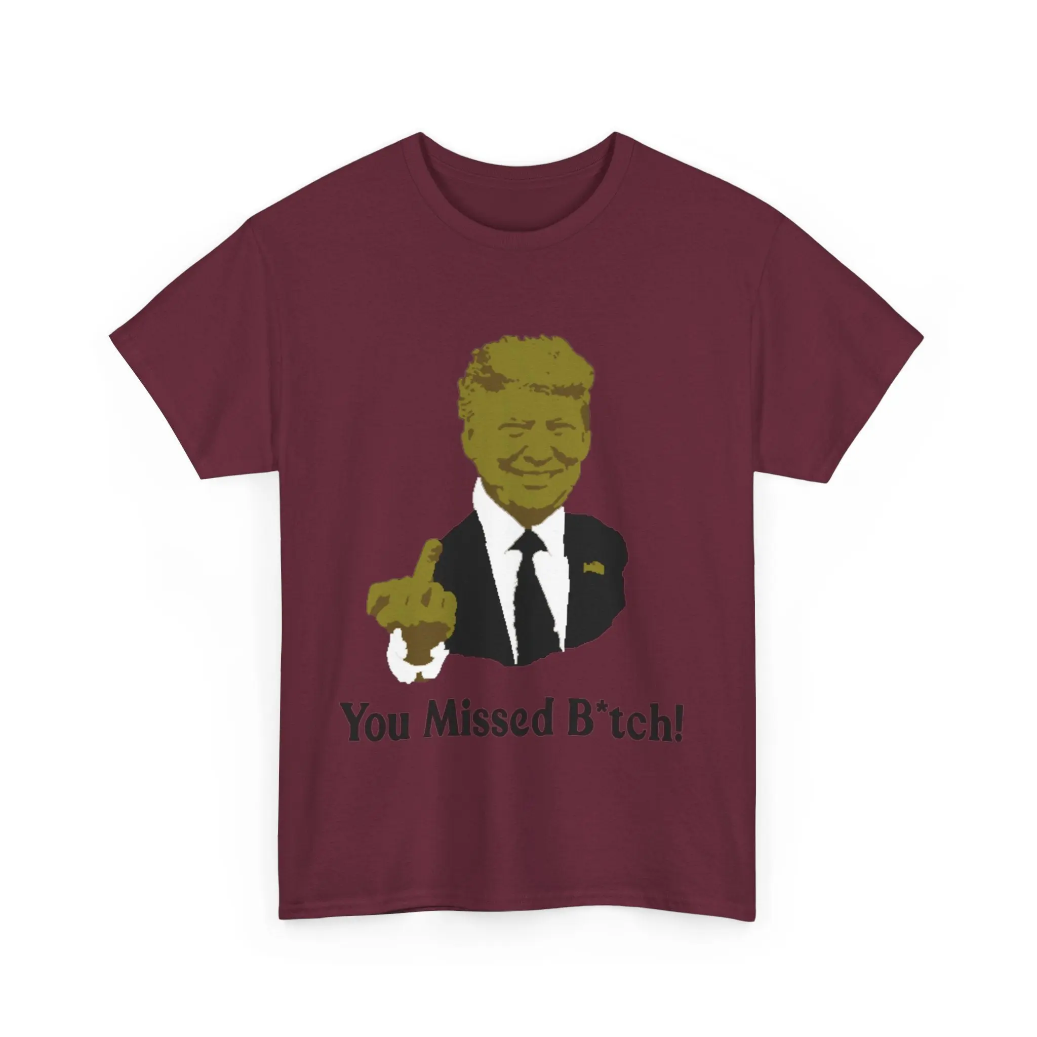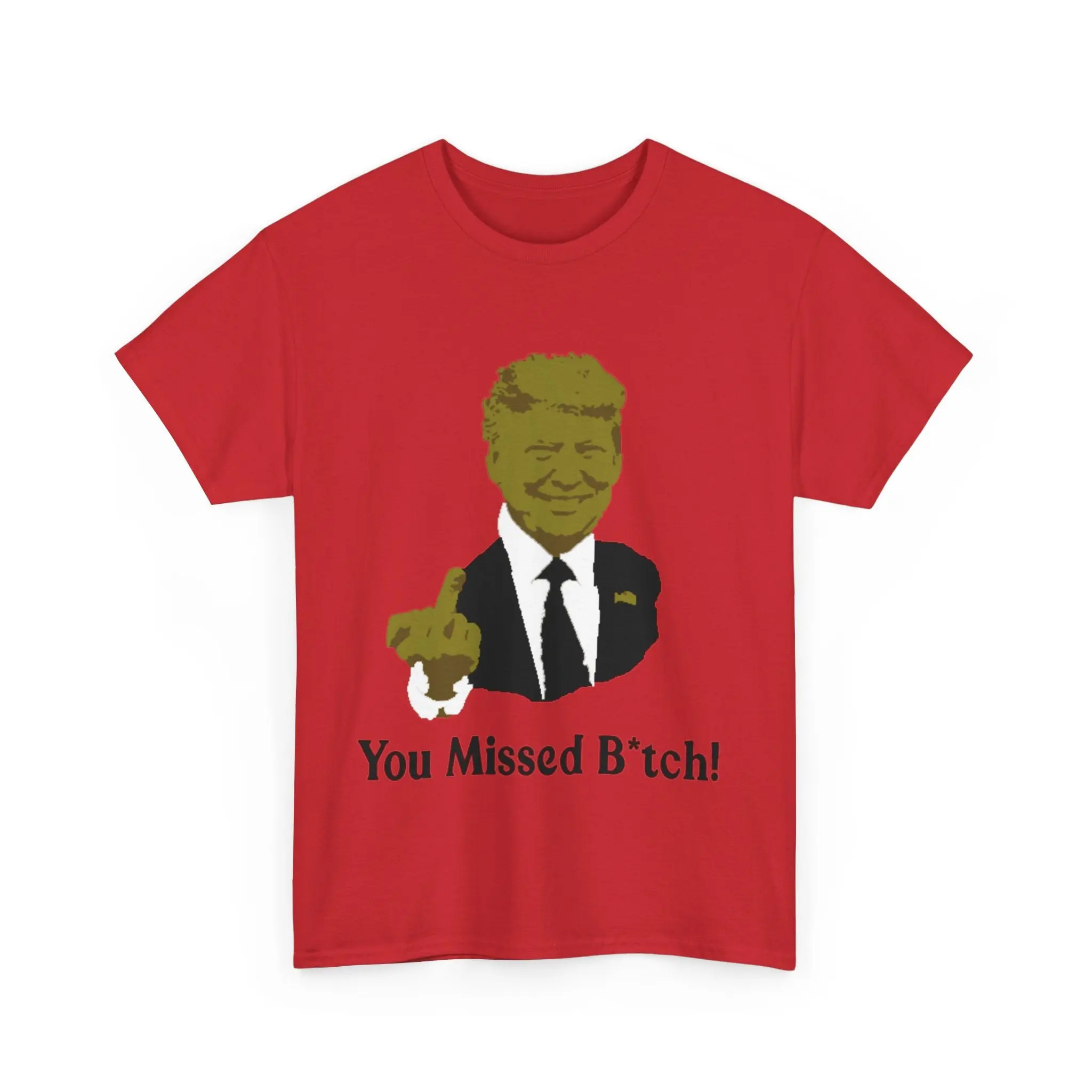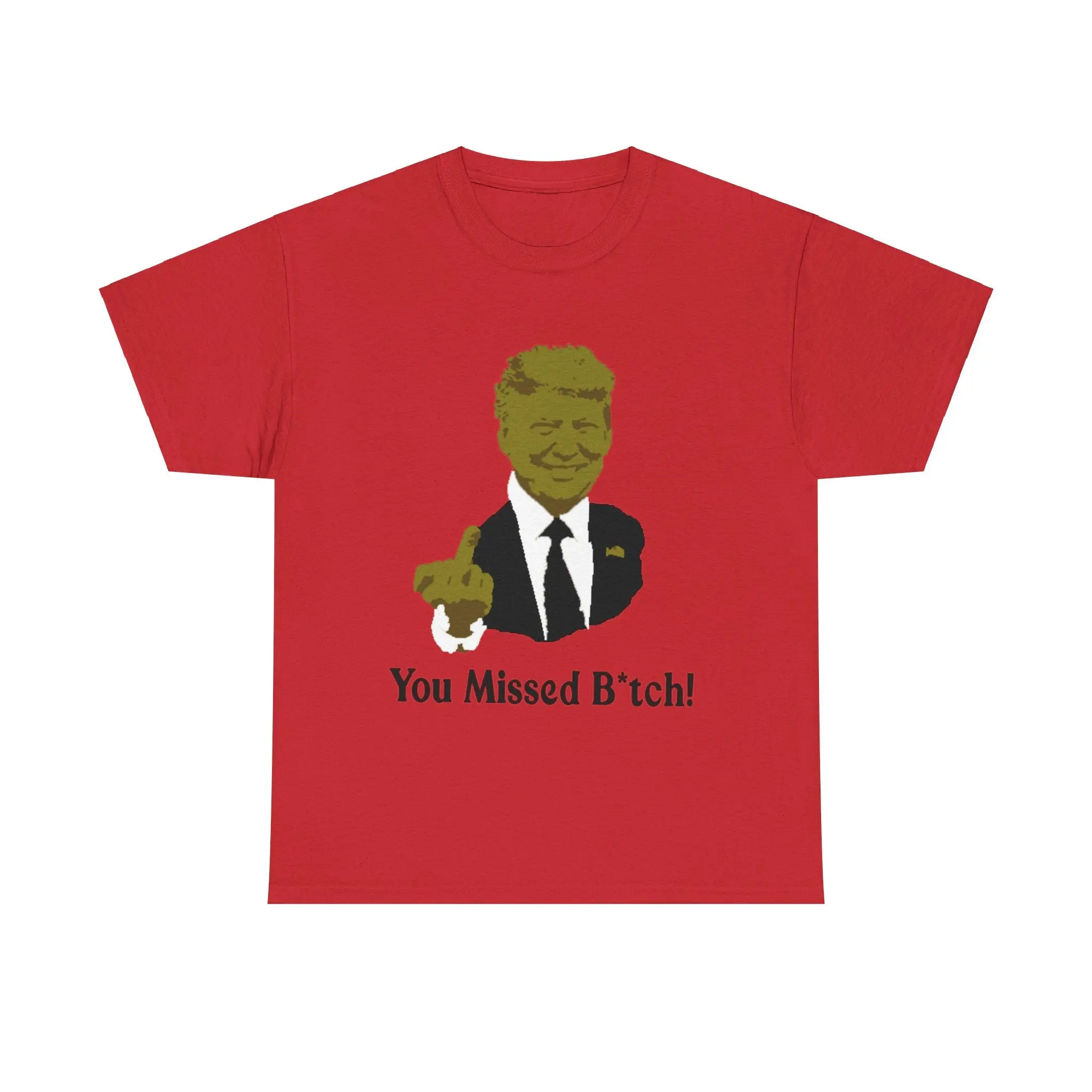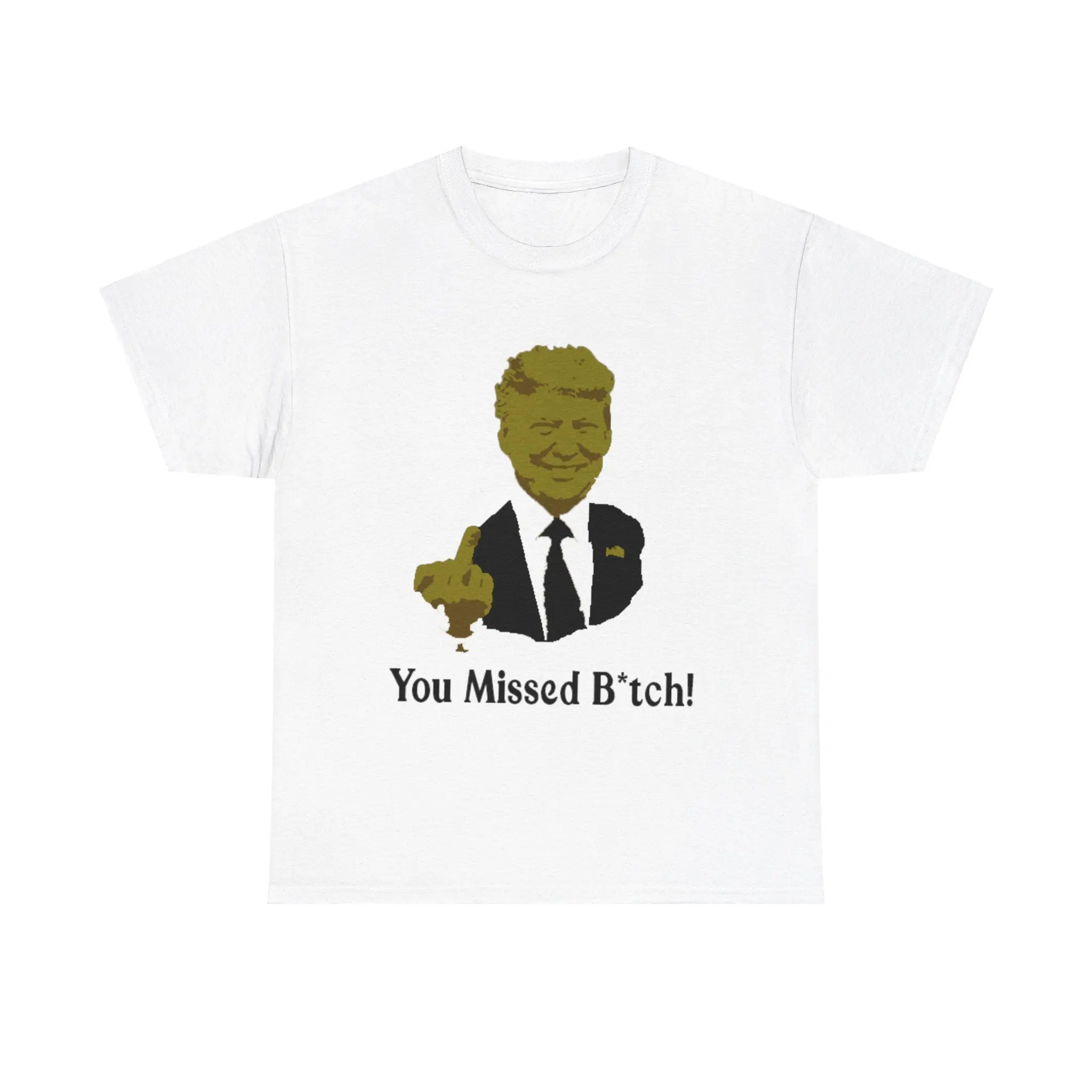 Make a bold statement with our "You Missed B*tch!" t-shirt featuring a striking image of Donald Trump. This eye-catching design is perfect for those who enjoy political satire and aren't afraid to wear their opinions proudly. The t-shirt showcases a confident and defiant image of Donald Trump, paired with the phrase "You Missed B*tch!" in bold, attention-grabbing text. The design is printed on high-quality, comfortable fabric that ensures durability and a great fit. Crafted from 100% premium cotton, this t-shirt offers a soft and breathable feel, making it perfect for everyday wear. The fabric is pre-shrunk to maintain its shape and size even after multiple washes.