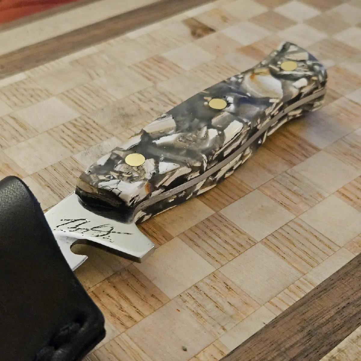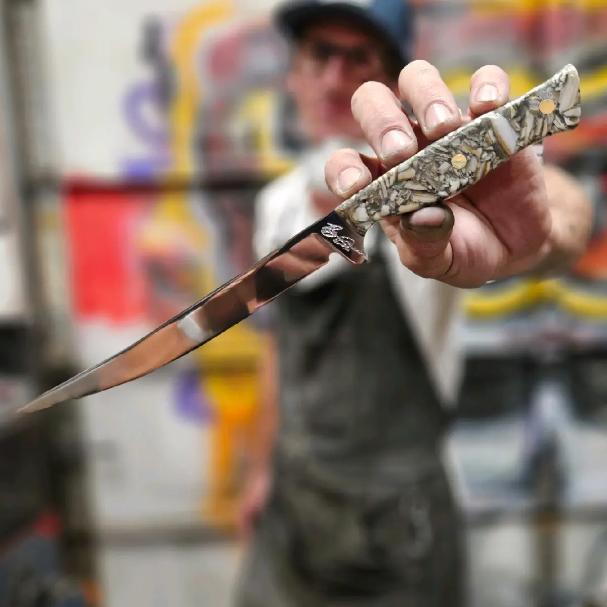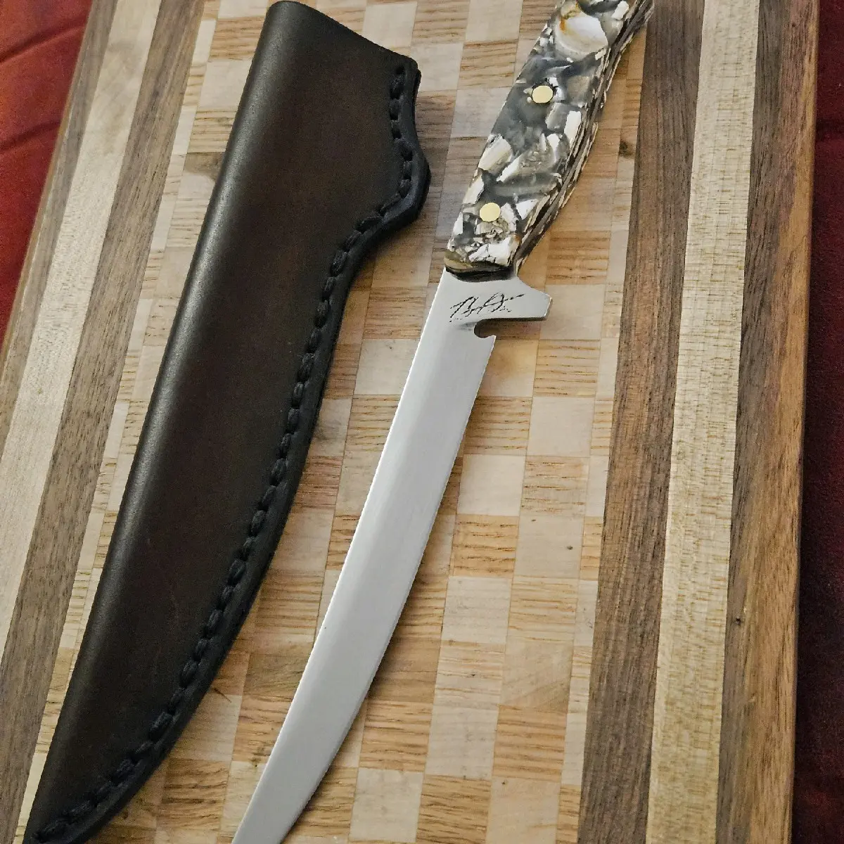 In conclusion, our hand forged fillet knife is a high-quality and durable kitchen tool that is perfect for all your cutting needs. Its unique Atlantic Seashell Handle and brass pins make it a stylish and functional addition to any kitchen. Get yours today and experience the difference that a hand forged knife can make in your cooking experience. includes COA and thick handmade leather sheath.