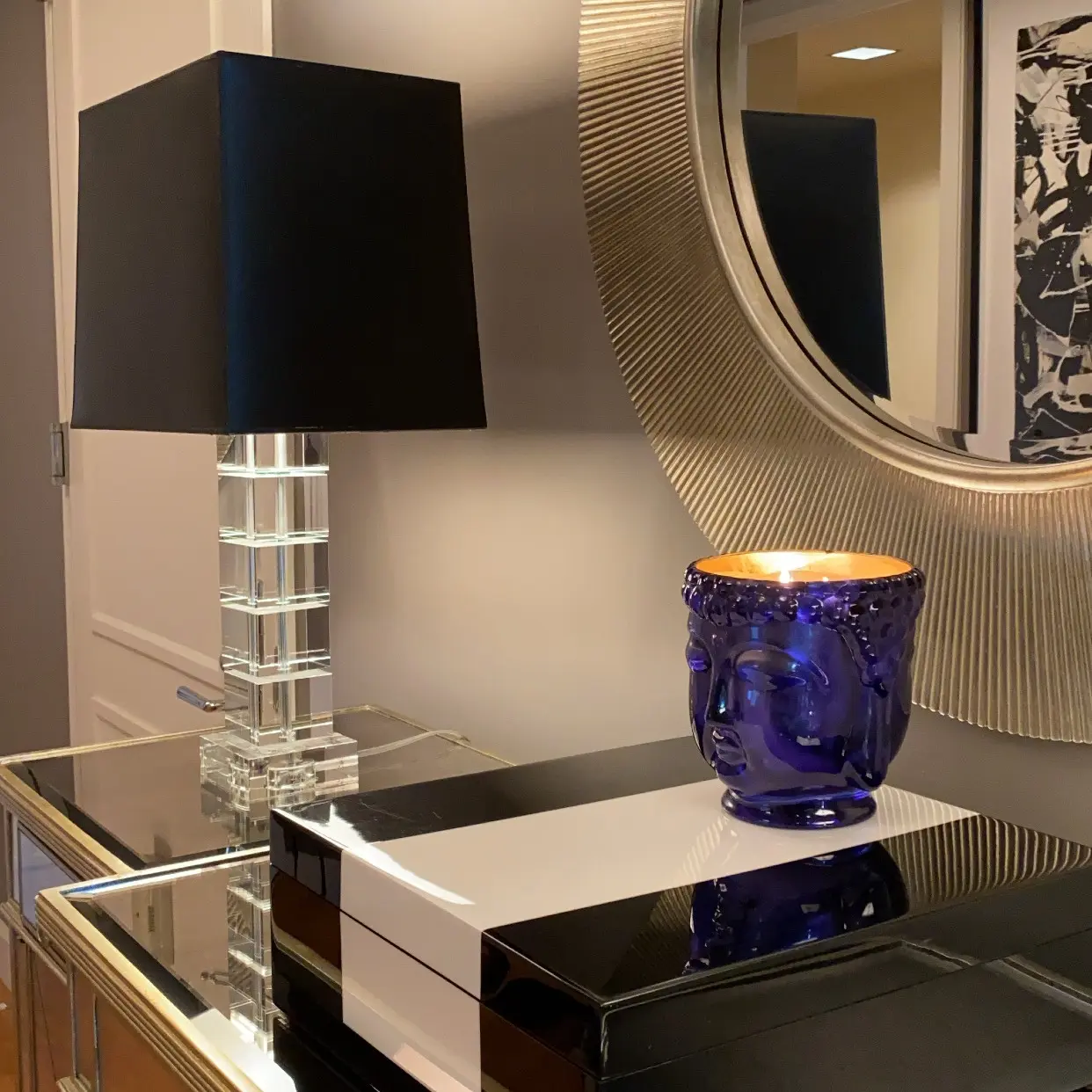 Indulge in the luxurious and regal atmosphere of our Thompson Ferrier Caesonia Sapphire Blue Glass Buddha Candle, a perfect blend of artistry and opulence.