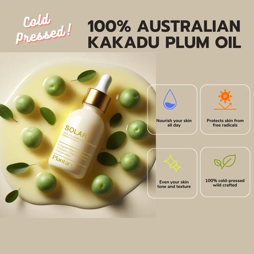 Elevate your skincare routine with Plantary O 100% Pure and Natural Kakadu Plum vitamin C Oil. This Australian cold-pressed, unrefined, and vegan formula is perfect for your face, hair, and body.