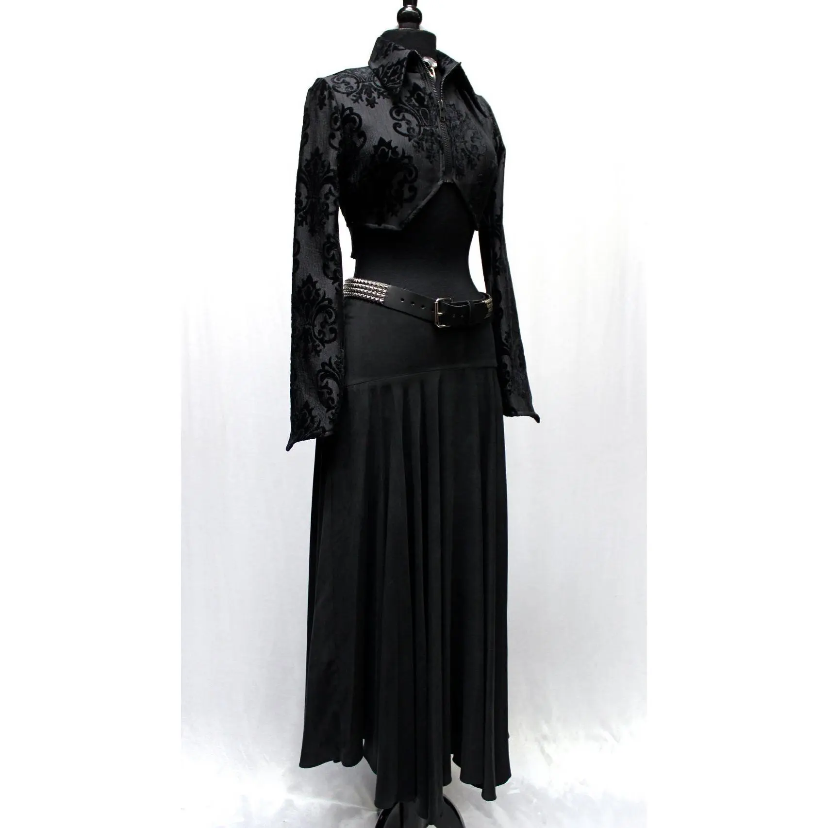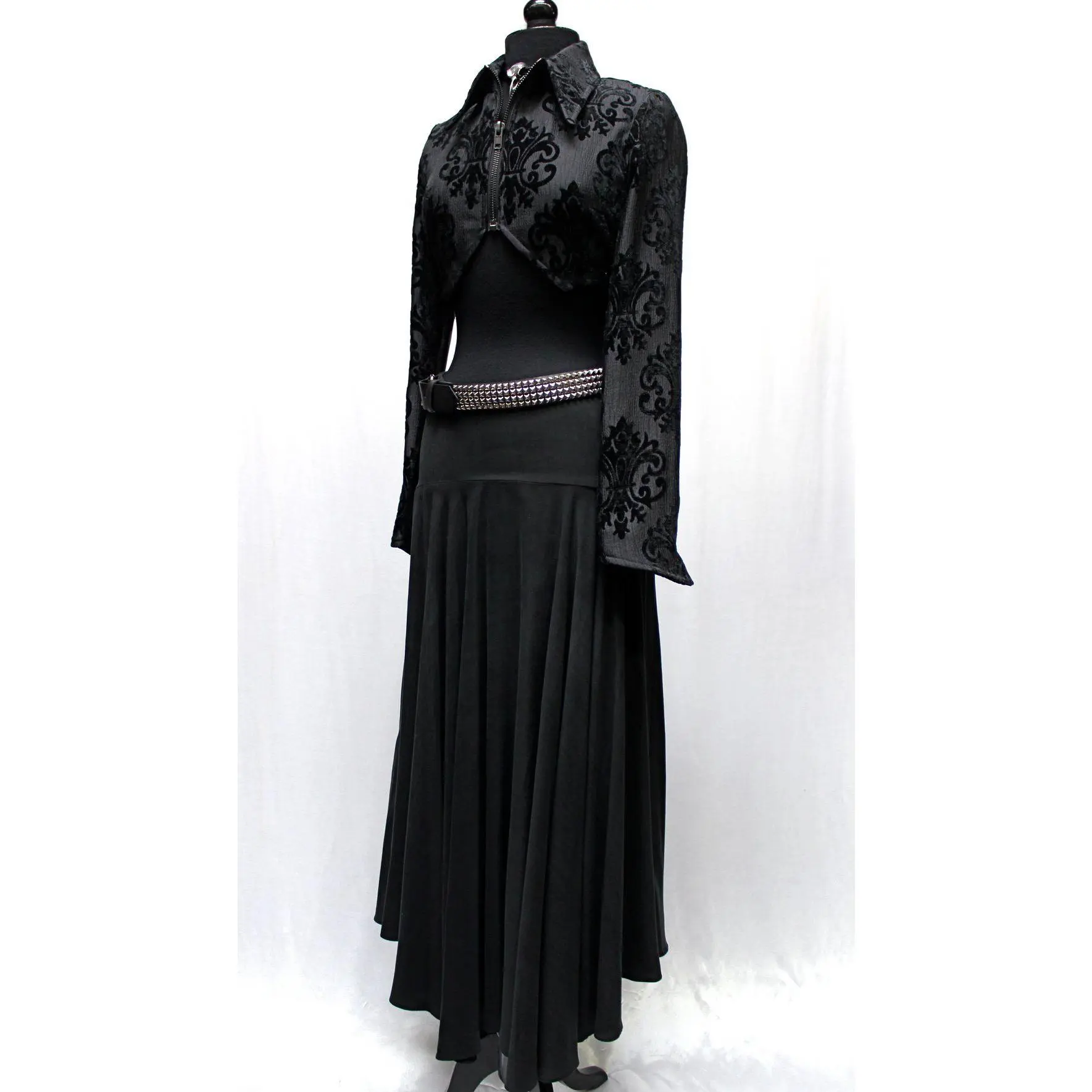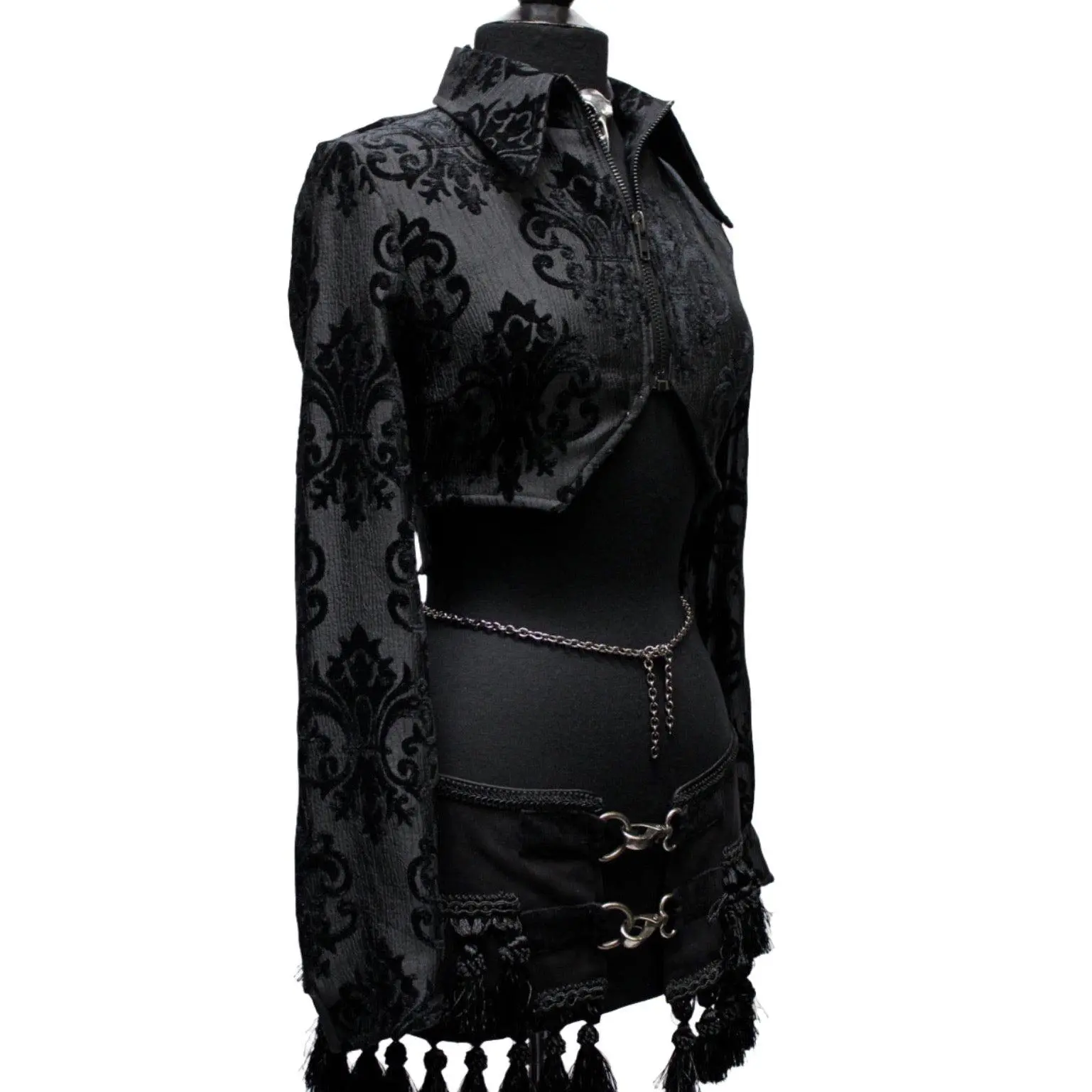 A jacket with a hauntingly dark style! A stylish women's crop jacket made in luxurious black fabric with a velvet flour-de-lis design on it. The jacket has a high pointed collar and zips in front with a blackened gunmetal zipper. The sleeves are tapered and have a pointy bell shaped cuff. In back the jacket has a fancy dove tail that is split in the middle. So much style! Comes in sizes Small-XXL.