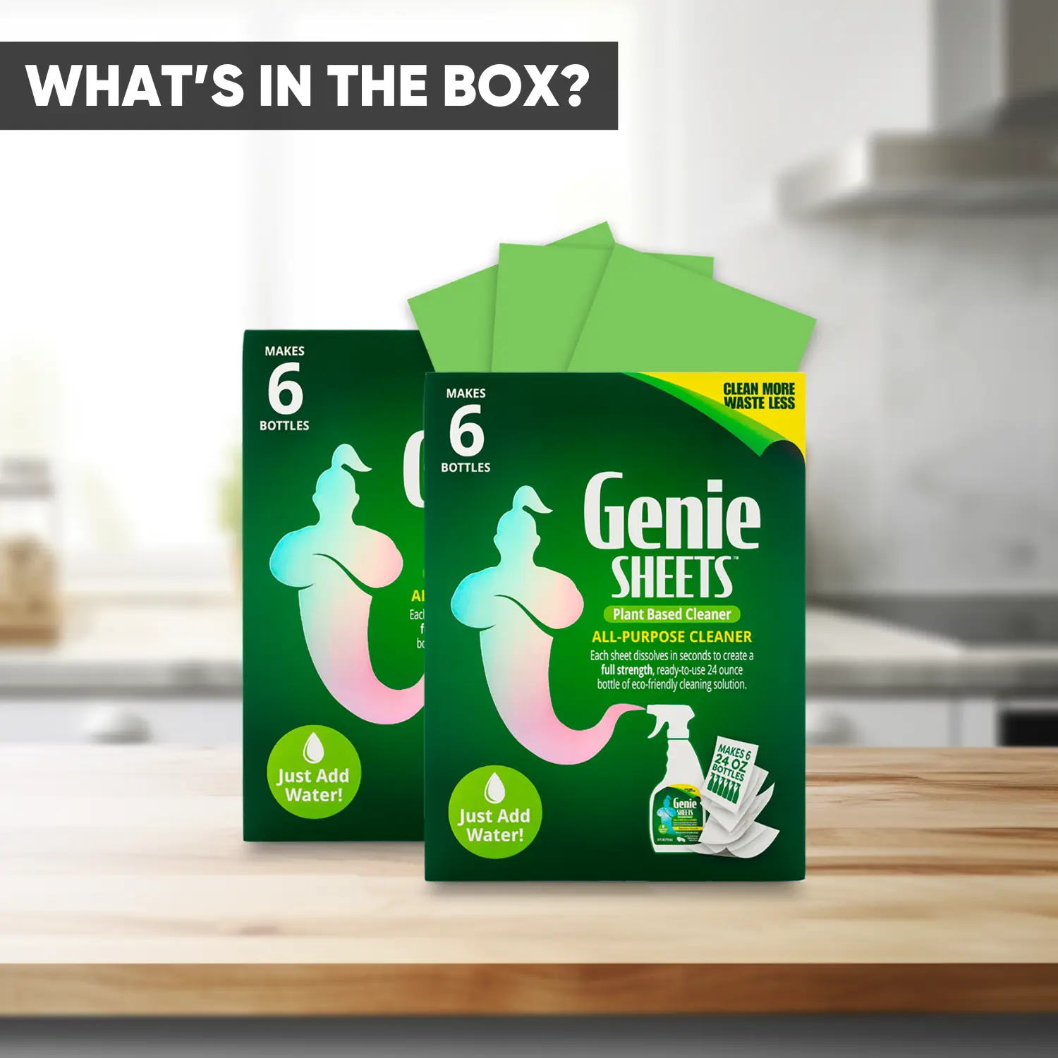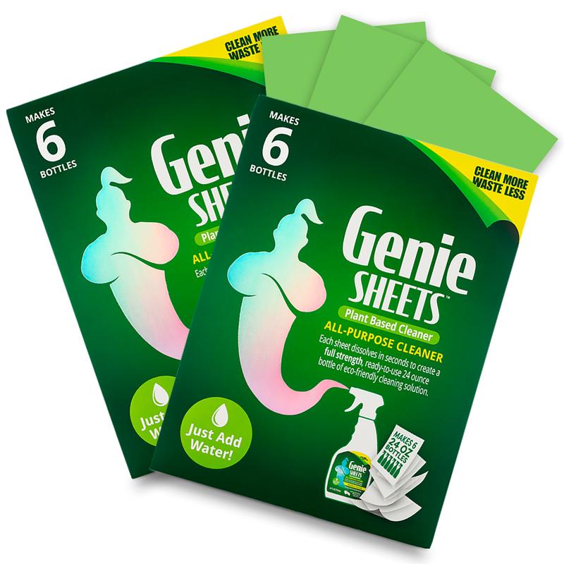 ·[12 BOTTLES] — One pack of Genie Sheets will make SIX BOTTLES of cleaning solution. You will receive 2 PACKS of Genie Sheets making a total of 12 BOTTLES. This saves you even more money on top of already saving the environment.
