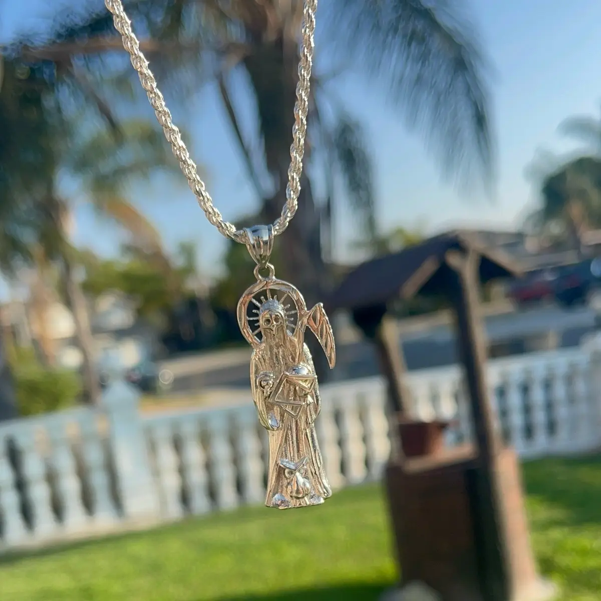 Elevate your style with the La Muerte ️ Chain Set in .925 silver. This set features a Santa Muerte pendant and rope chain, adding a bold statement to any outfit. Crafted with quality and style in mind, it's the perfect addition to your jewelry collection.
