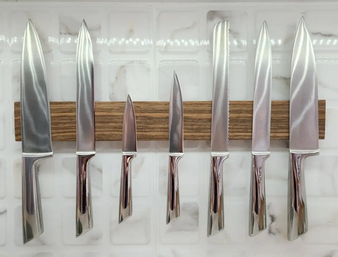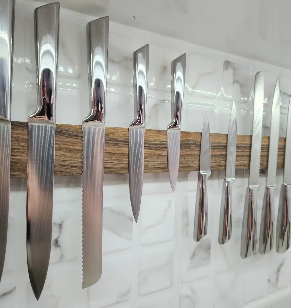 Your custom knife holder is made with high-strength neodymium magnets, carefully selected and positioned based on the knife holder size you choose.Our standard configuration securely holds most everyday kitchen knives. If you plan to hang heavier or specialty knives, please contact us before ordering or leave a note at checkout so we can adjust the magnet configuration accordingly to ensure a safe and secure hold.