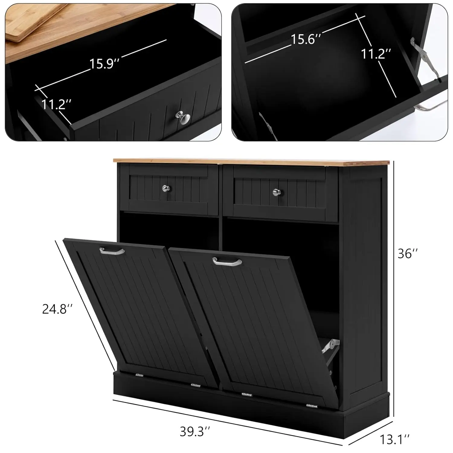 ·【MULTIFUNCTIONAL PLATE】The trash can cabinet includes a movable bamboo cutting board that fits nicely onto the drawer top providing additional cutting space that can be brought straight to the table.