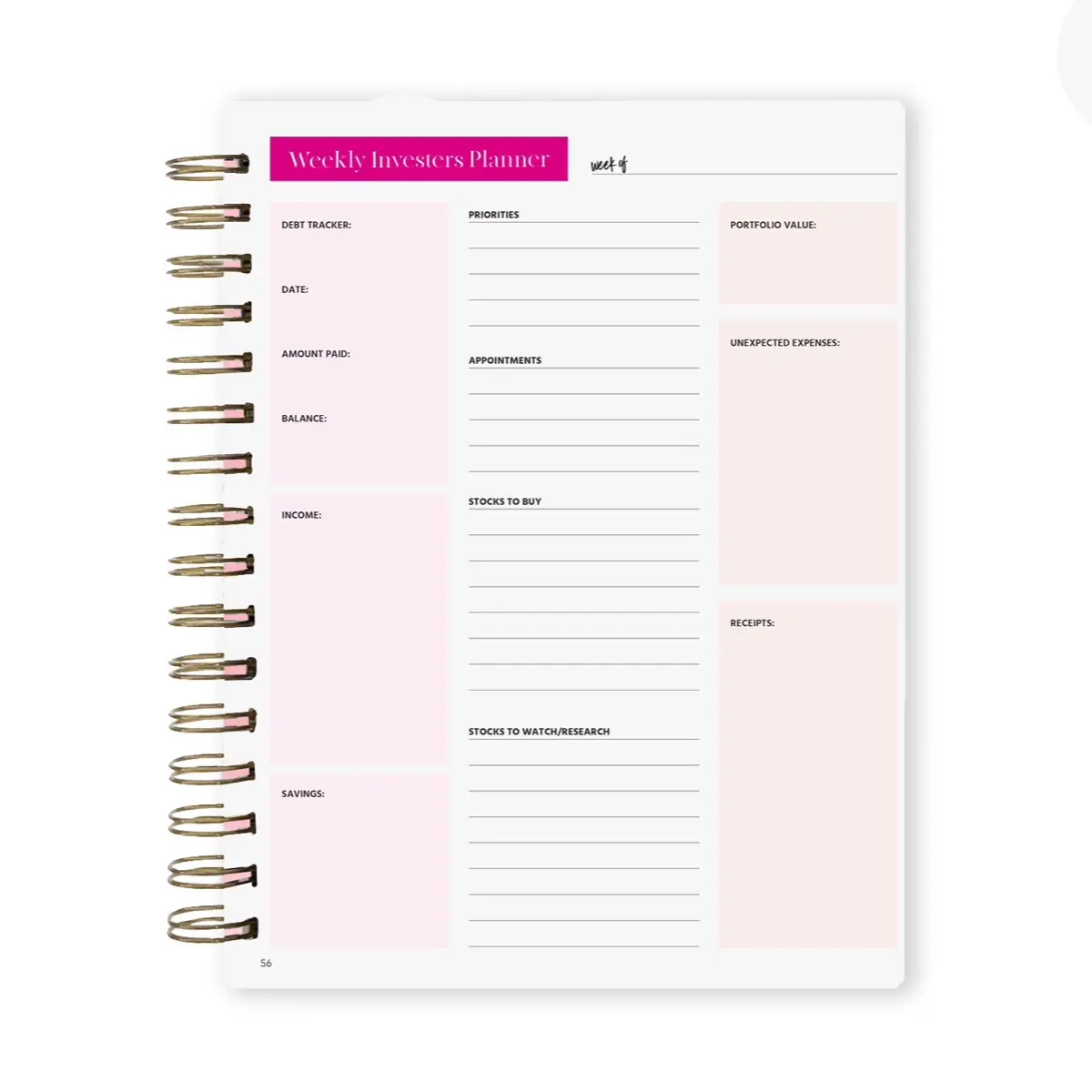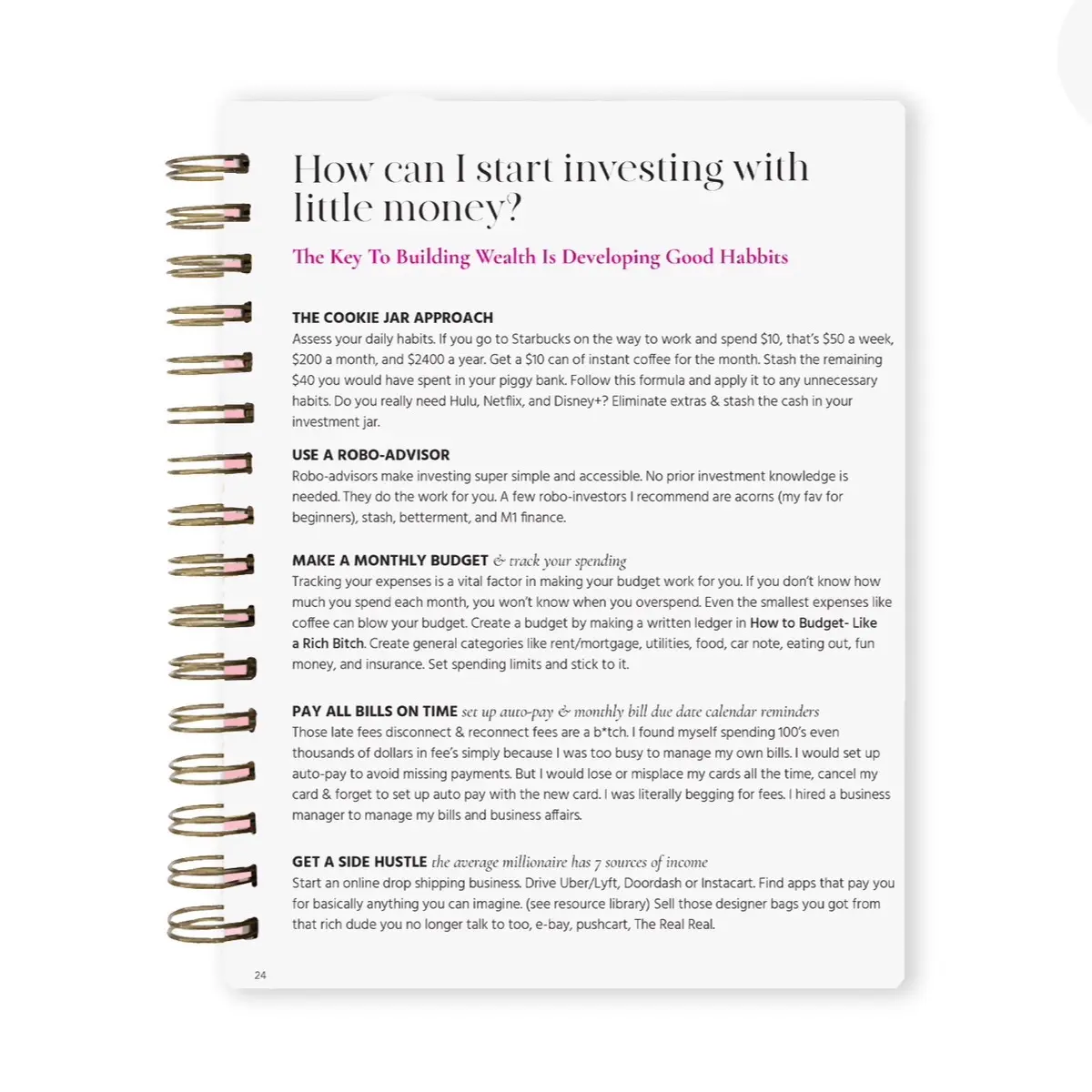 The first 55 pages is a hands on workbook where you will dive into the deep end of the market, equipped with cute pink floaties. Immediately following is my unique 90 day financial planner system.