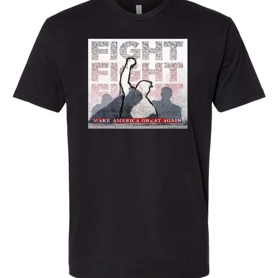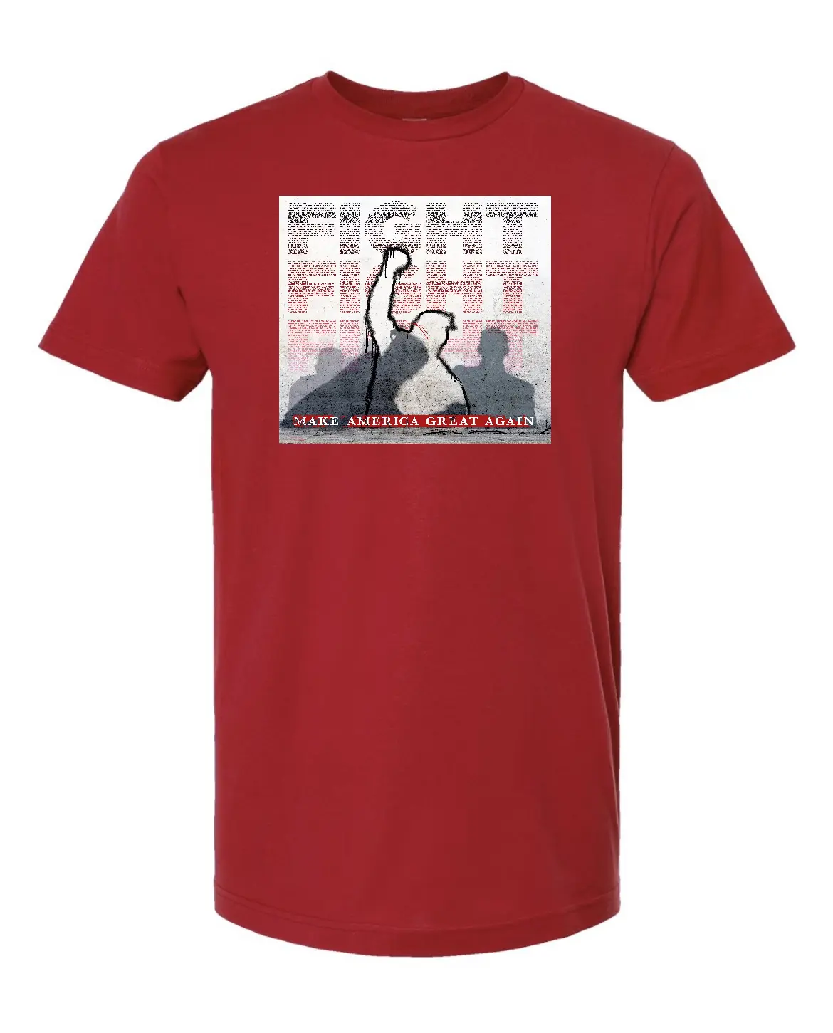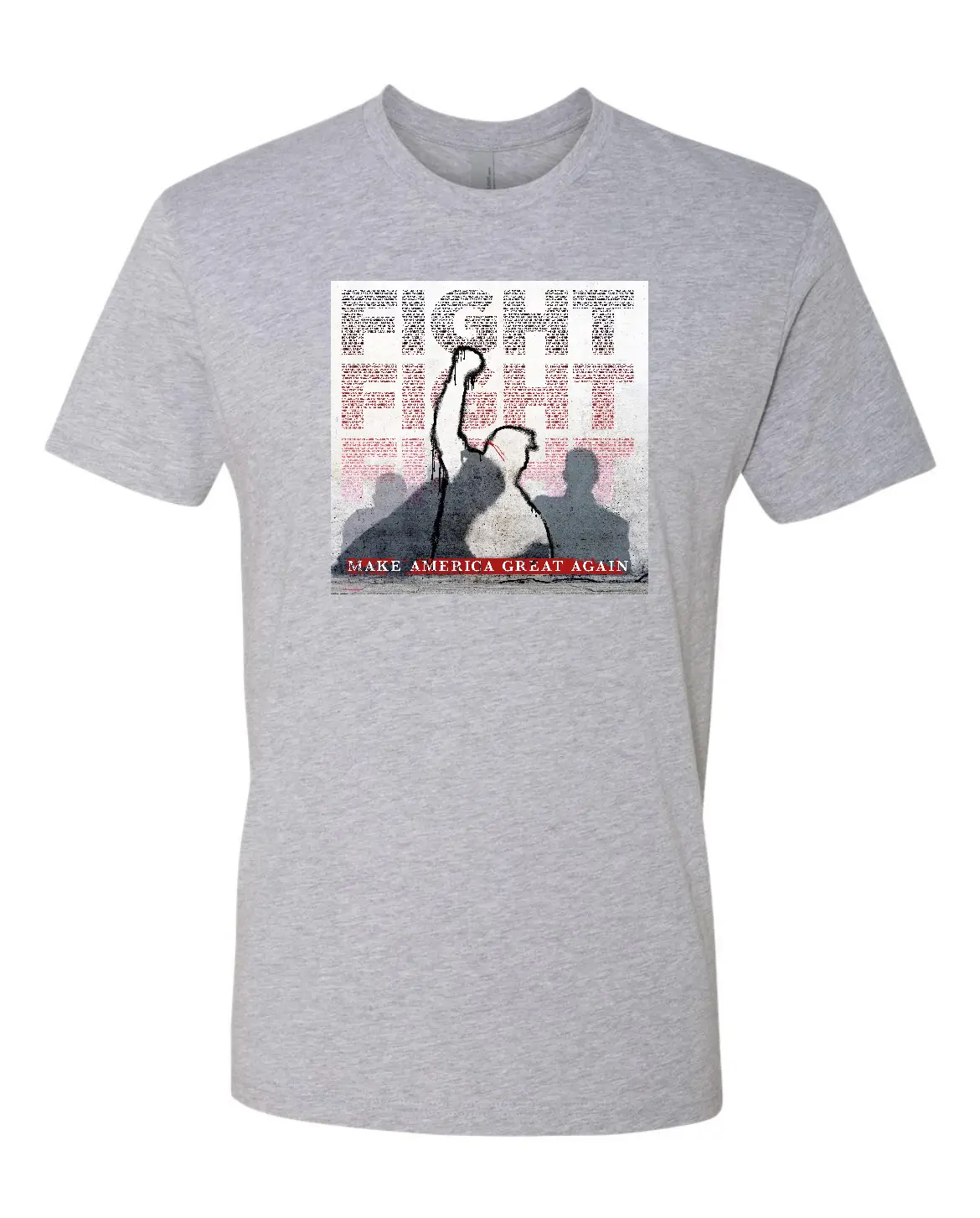 This unisex t- shirt features the iconic image of president Donald Trump during the moment of an attempted assassination. And In the background, the word "FIGHT FIGHT FIGHT" is boldly displayed, crafted from the phrase "Make America Great Again." The design captures a moment of resilience and determination, symbolizing the enduring spirit of Trump's political journey and his supporters' unwavering resolve.