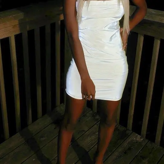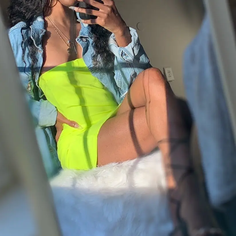 This neon green strapless midi dress is a unique and eye-catching piece that is sure to turn heads. The strapless design allows for a more open and free-flowing look, while the midi length provides a modest yet stylish option for various occasions. The dress is made of reflective material, which adds a unique and edgy touch to the overall design.