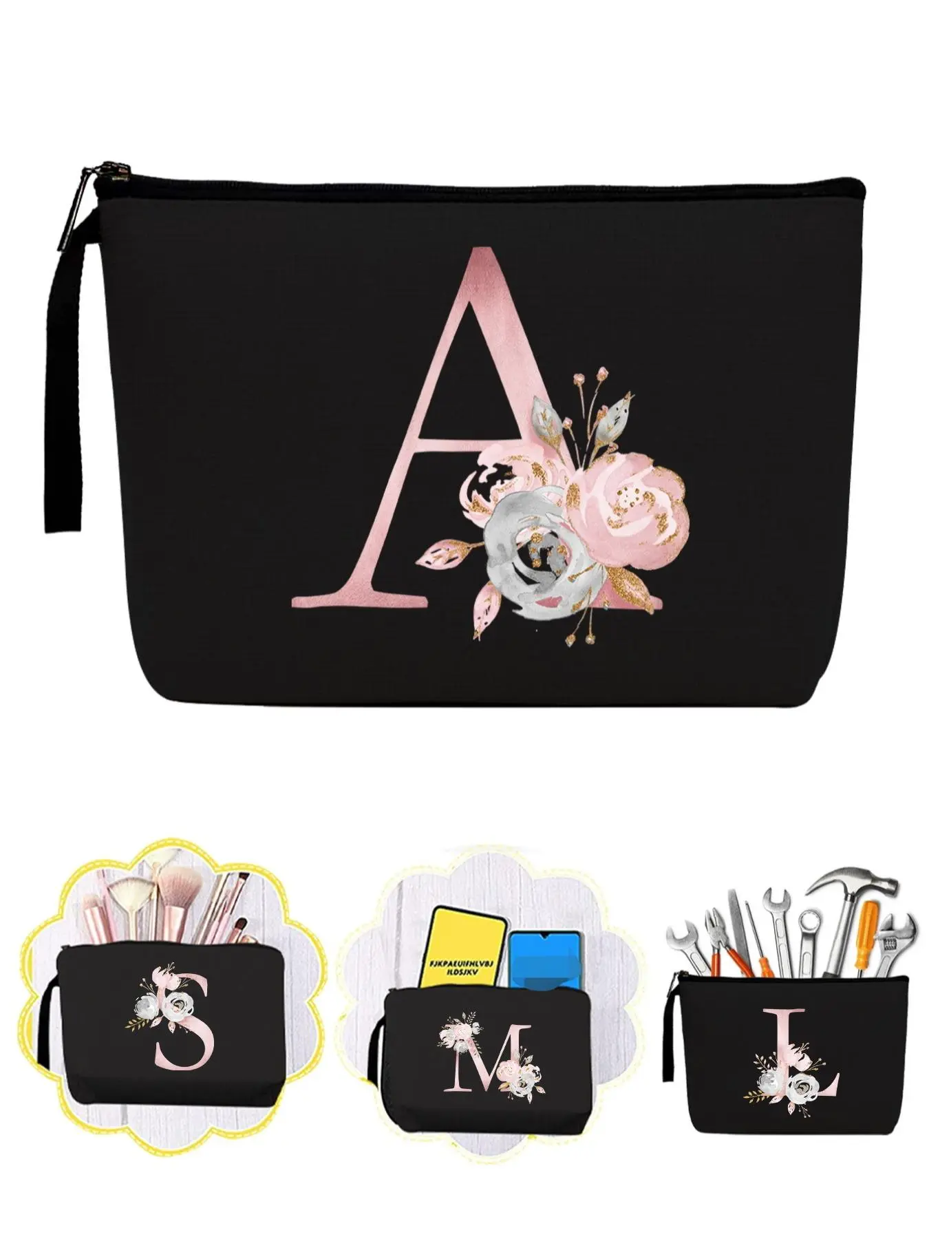 Letter & Floral Pattern Makeup Bag, Initial Letter Print Portable Cosmetic Bag, Travel Canvas Cosmetic Storage Bag, Birthday Gift, Makeup Organizer Pouch