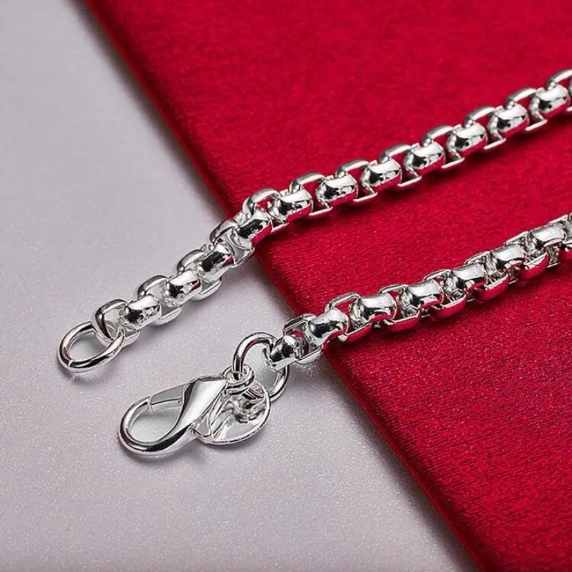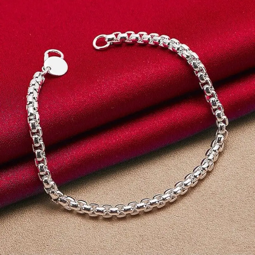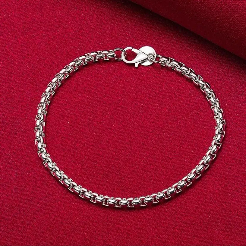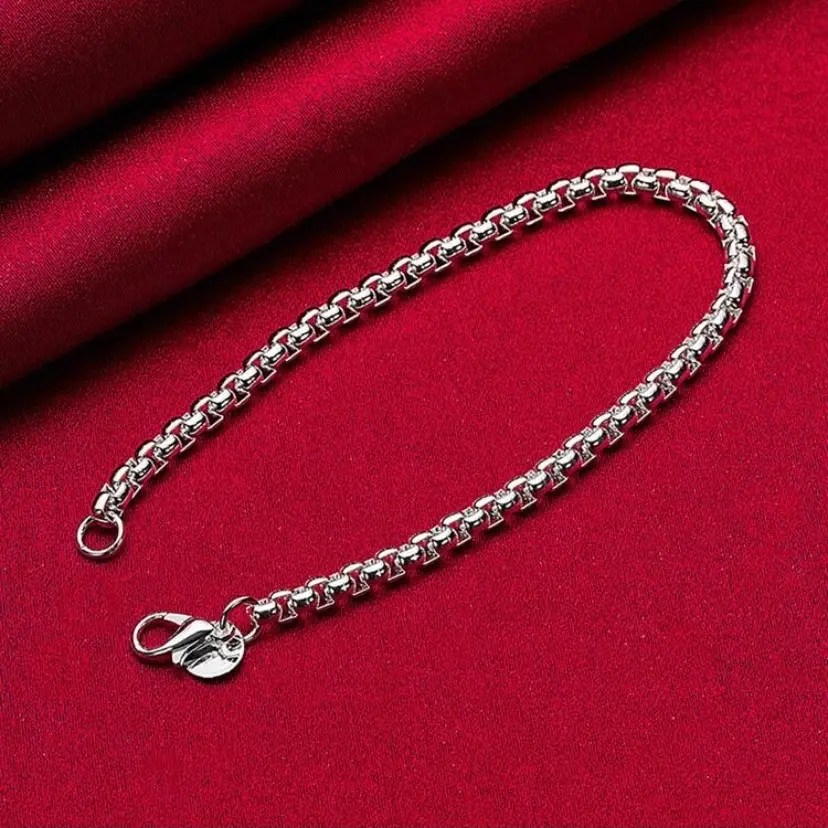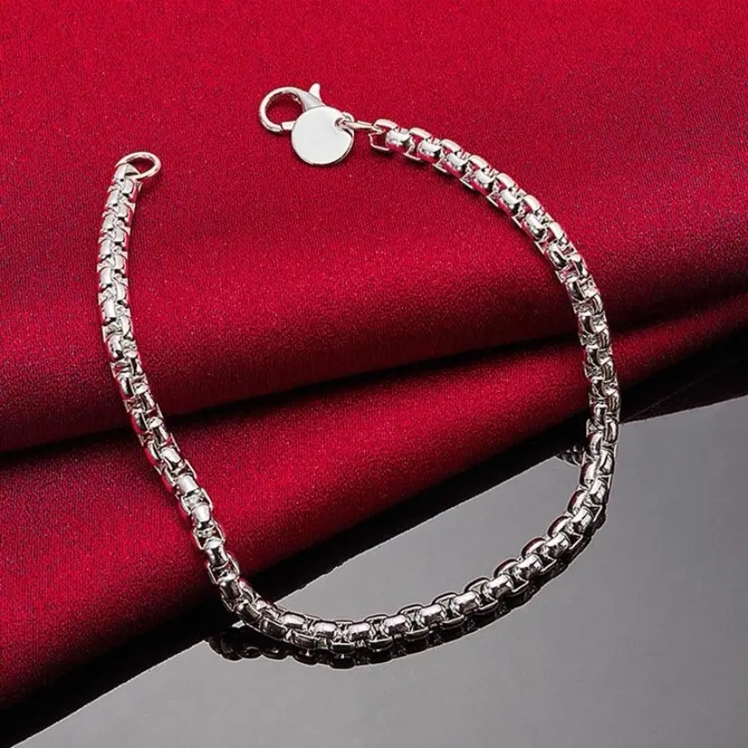 This bracelet is a beautiful piece of jewelry made of 925 sterling silver. The material is known for its durability and long-lasting quality, making it a great choice for everyday wear. The round shape of the bracelet adds a classic and timeless look to the piece, while the 4mm box chain design adds a delicate and intricate detail that enhances the overall design of the bracelet.