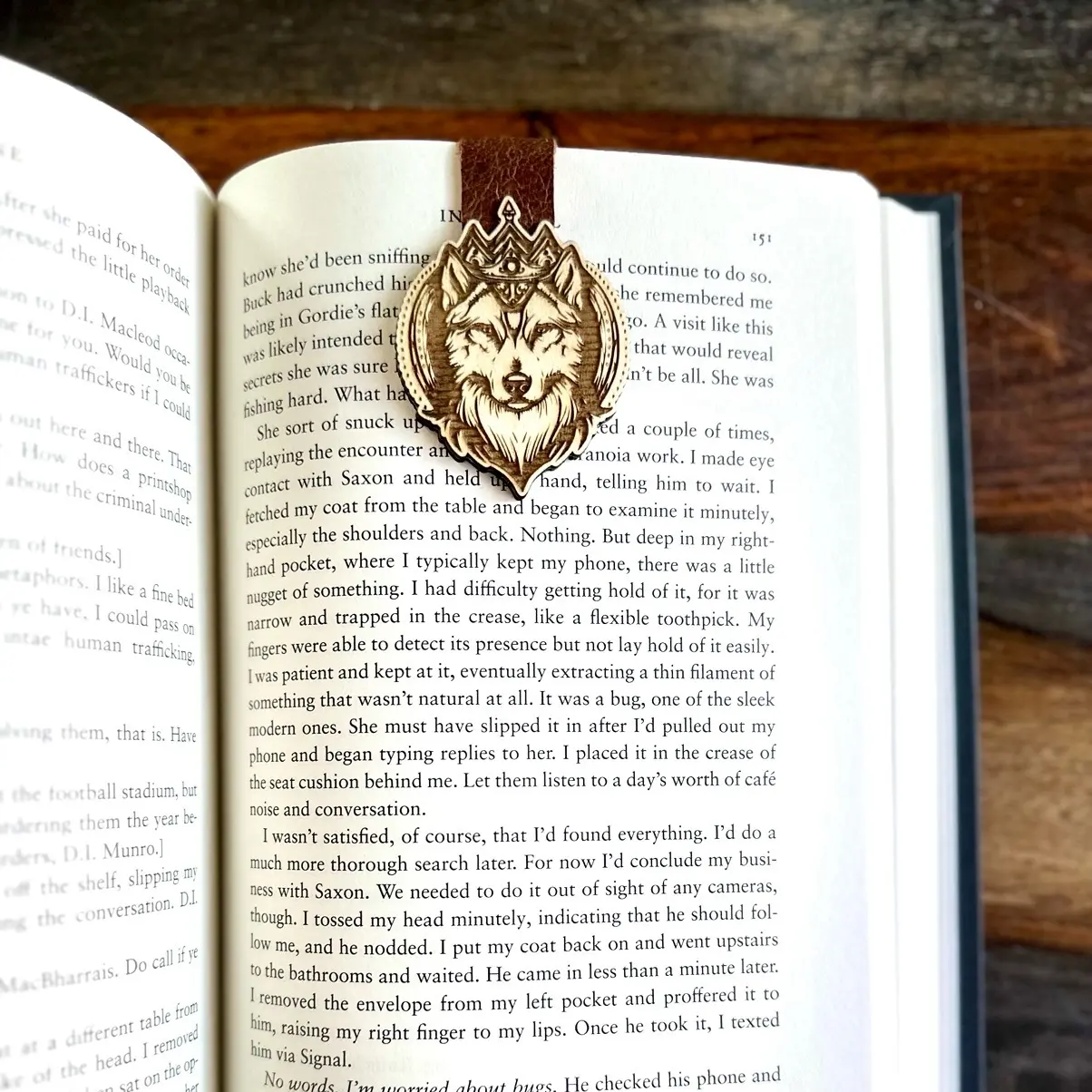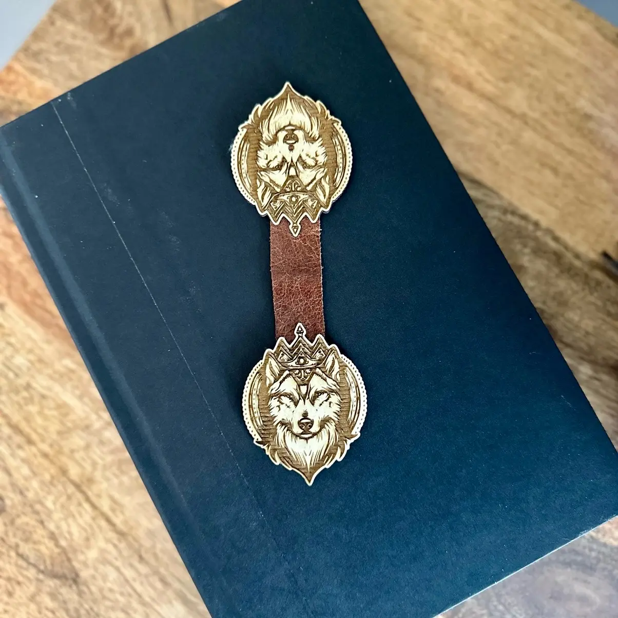 Magnetic Wood and Leather Wolf Bookmark.
