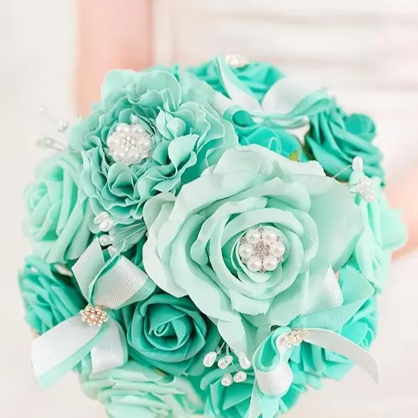 ·Material: The tossing bouquet consists of teal green ranunculus, teal green rose, PE foam teal green rose and finally decorated with white pearls and teal green bow ribbon. The flowers and branches are beautiful in lines and distinct in layers. Prepare for an exquisite and chic wedding.