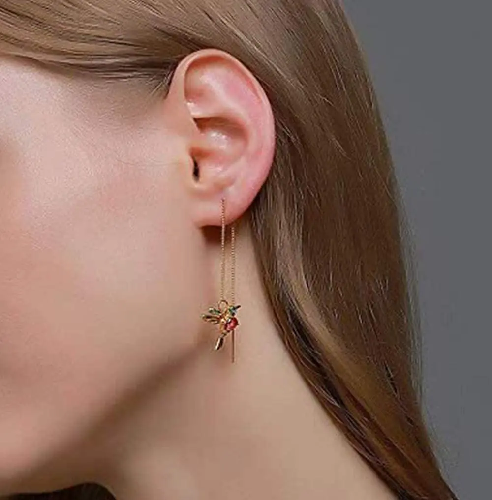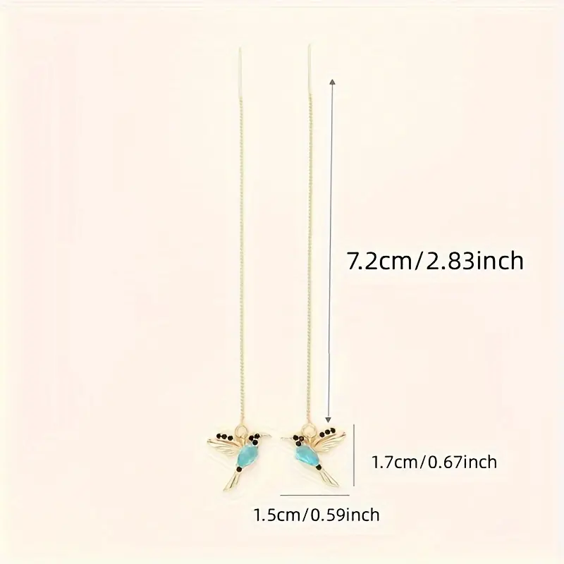 Blue Zircon Cute Hummingbird Bird Long Tassel Chain Earrings Crystal Bird Dangle Drop Earrings Threader Long Crystal Rhinestone Drop Dangle Women Ladies Jewelry