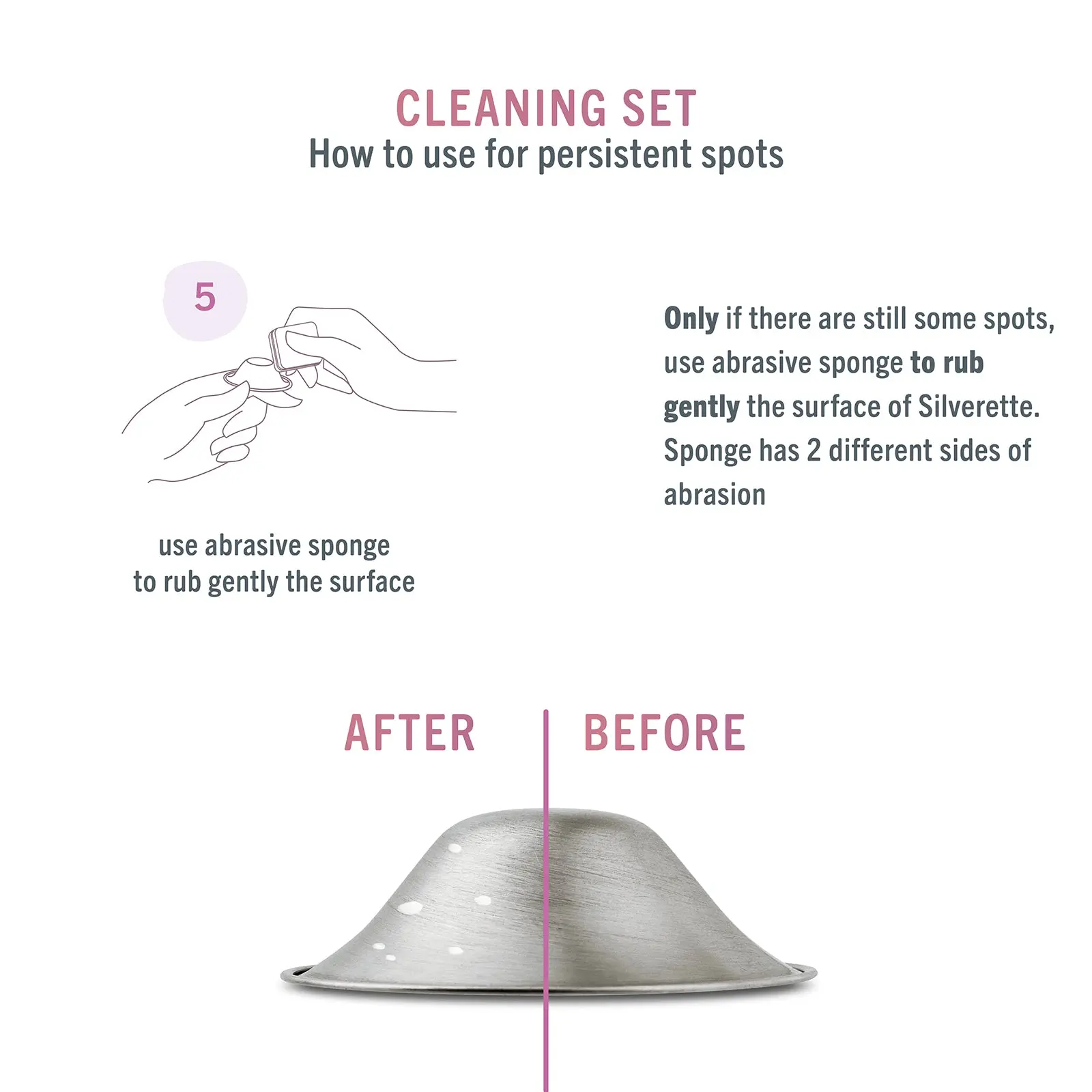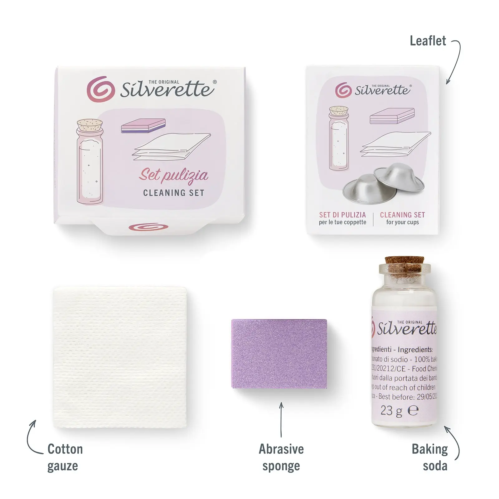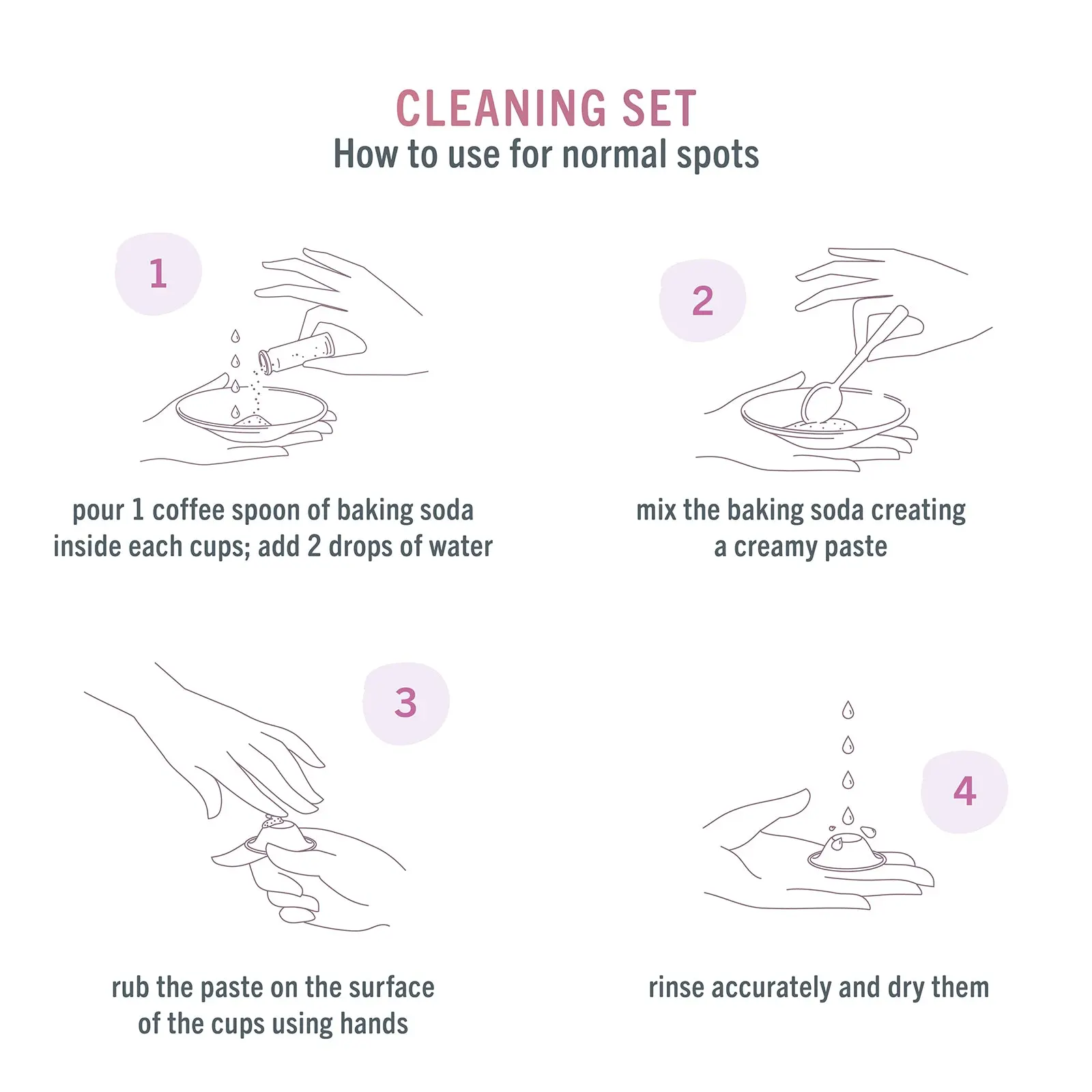 Silverette CLEANING AND MAINTENANCE SET. To clean your SILVERETTE cups, pour 1 teaspoon of baking soda into the cup and add 2 drops of water . Mixing it will create a creamy paste . Pass it on the entire surface of the cups with your hands , rinse thoroughly and dry . If there are more persistent stains, use the abrasive sponge to rub gently .