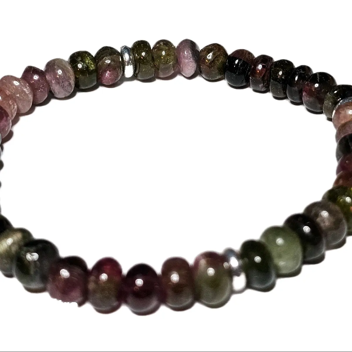 Natural Watermelon Tourmaline 6mm+ Length is 7". Beads are donut shaped and hand tumbled. They are imperfections add to their charm. A beautiful piece of crystal bead jewelry. Made with durable stretch string.