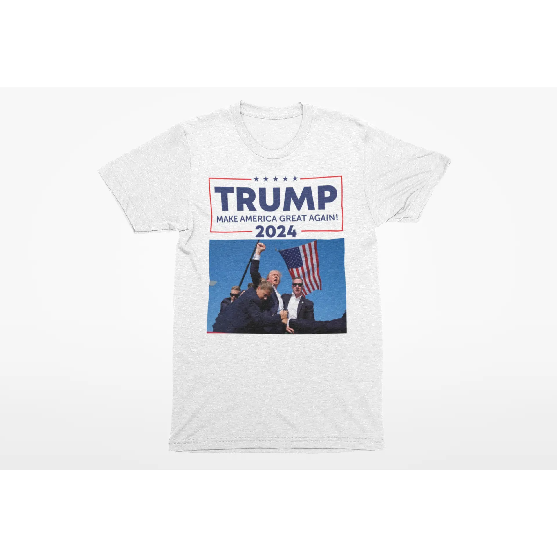 Celebrate the unwavering spirit and resilience of a leader who has faced adversity head-on with our exclusive "Resilience" Trump T-Shirt. Designed in the wake of an unprecedented moment, this shirt symbolizes strength, determination, and the unyielding spirit of a true fighter.