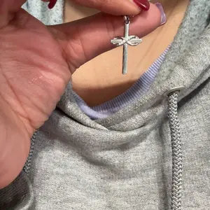 This dainty delicate infinity cross is stunning. She’s silver, shiny and stackable.