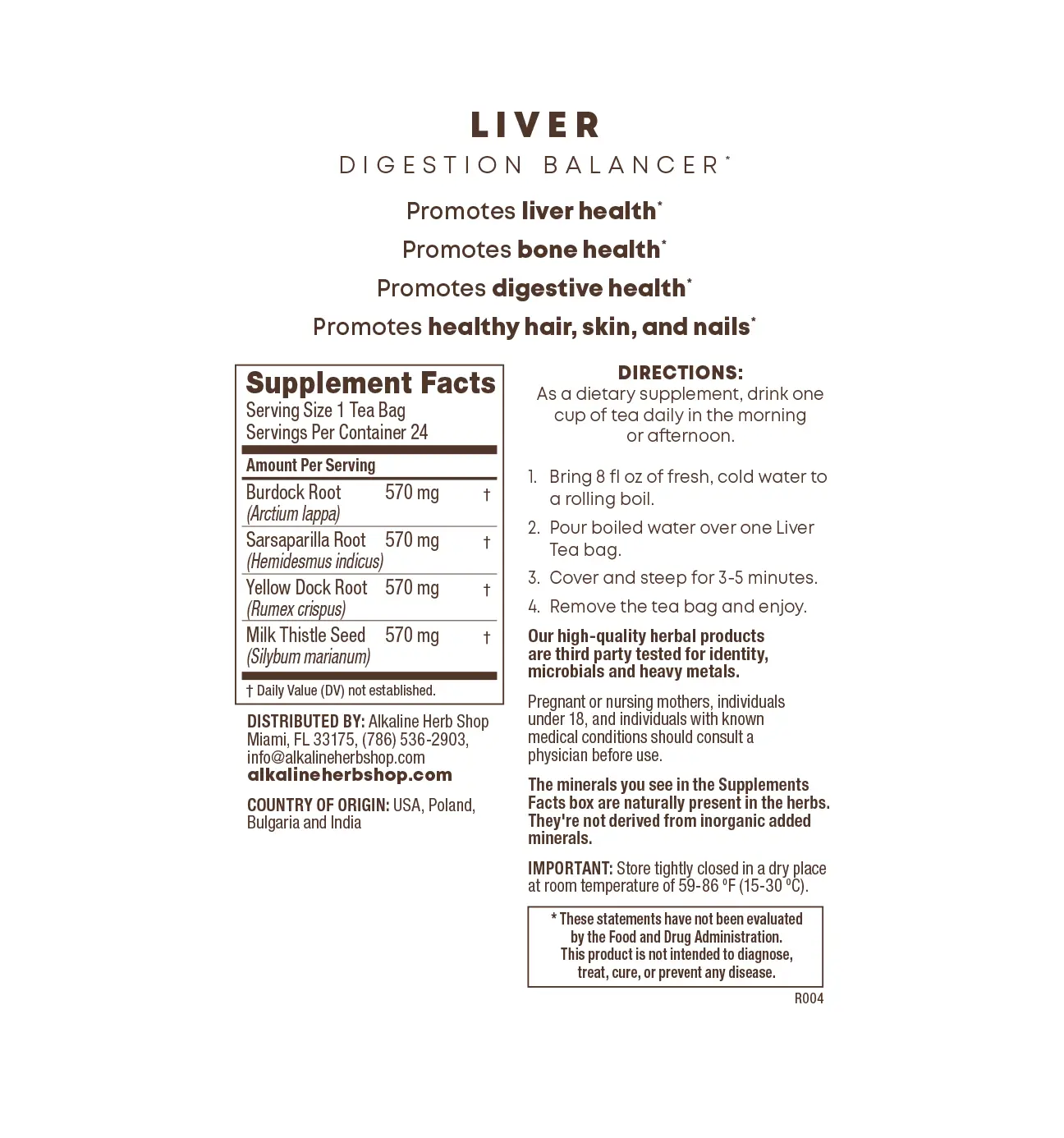 Each tube contains 24 tea bags and is made from wildcrafted and organic herbs. Ingredients include burdock root, yellow dock root, sarsaparilla root and milk thistle seed.