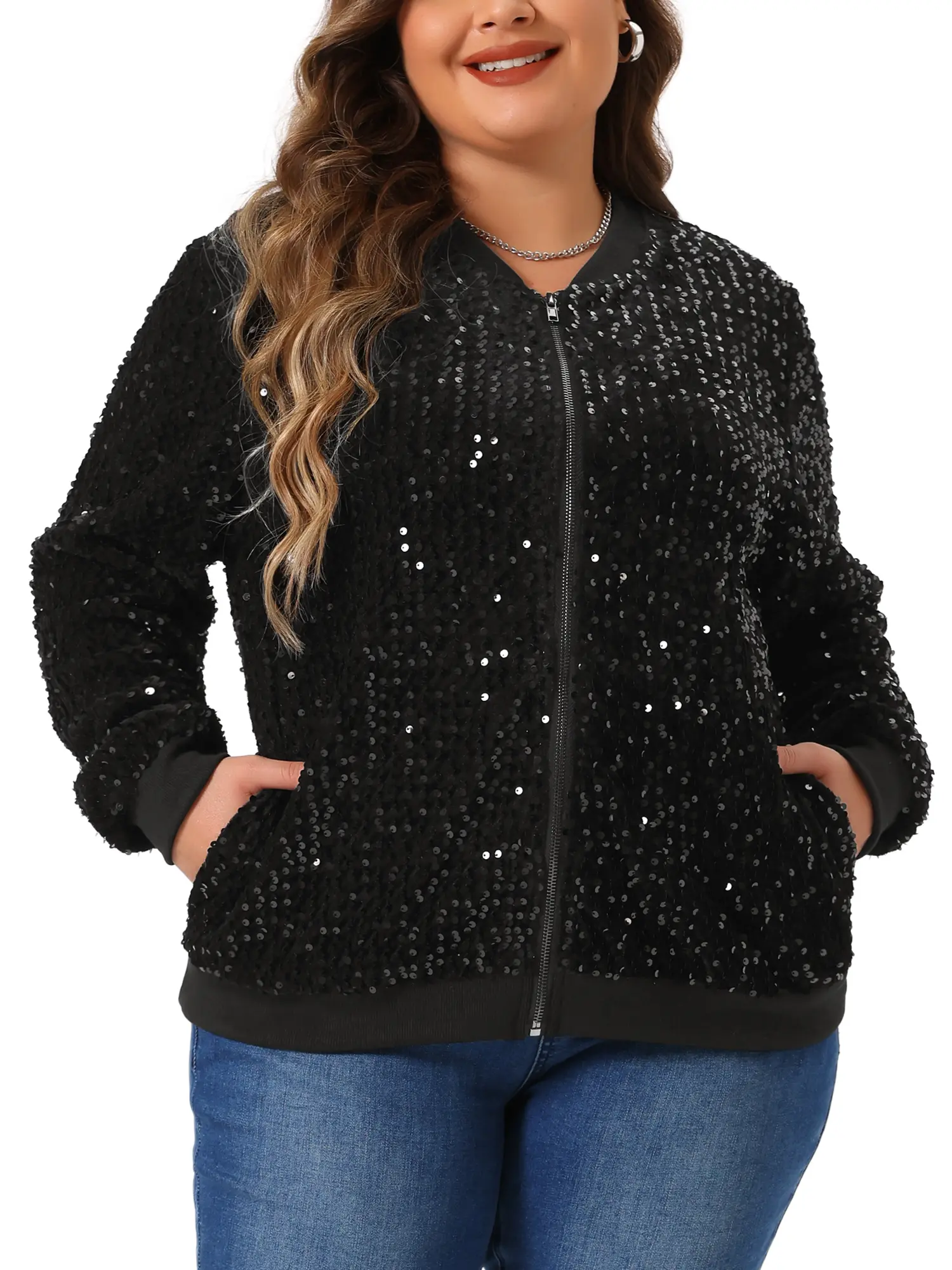 Women's fashion sequin jacket features side pockets, full zip up closure in front, and the rib design at collar, cuff and bottom