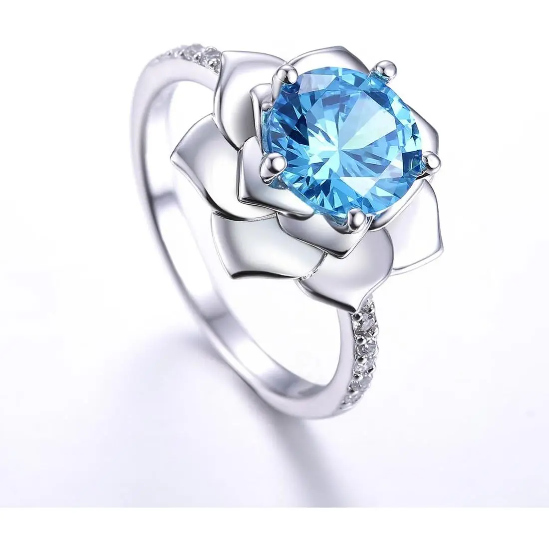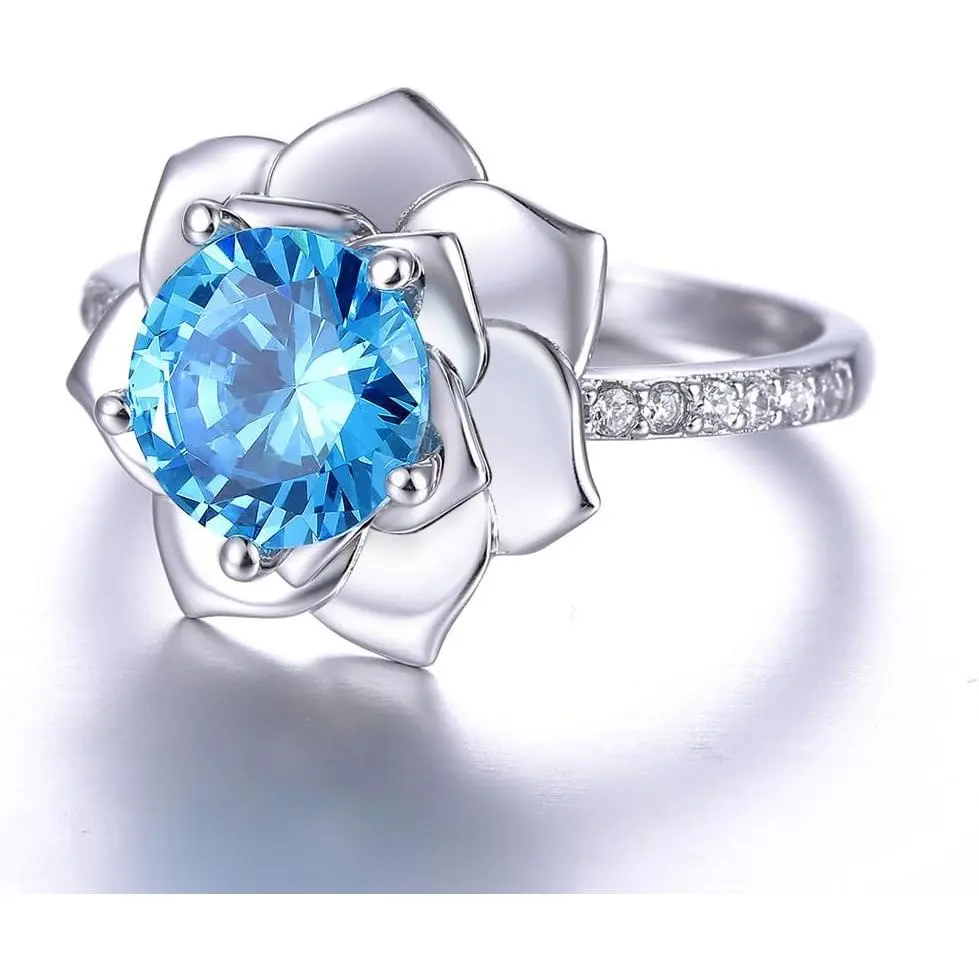 8x8mm Round Simulated Blue Topaz 925 Sterling Silver Blossom Flower Lotus Ring for Women