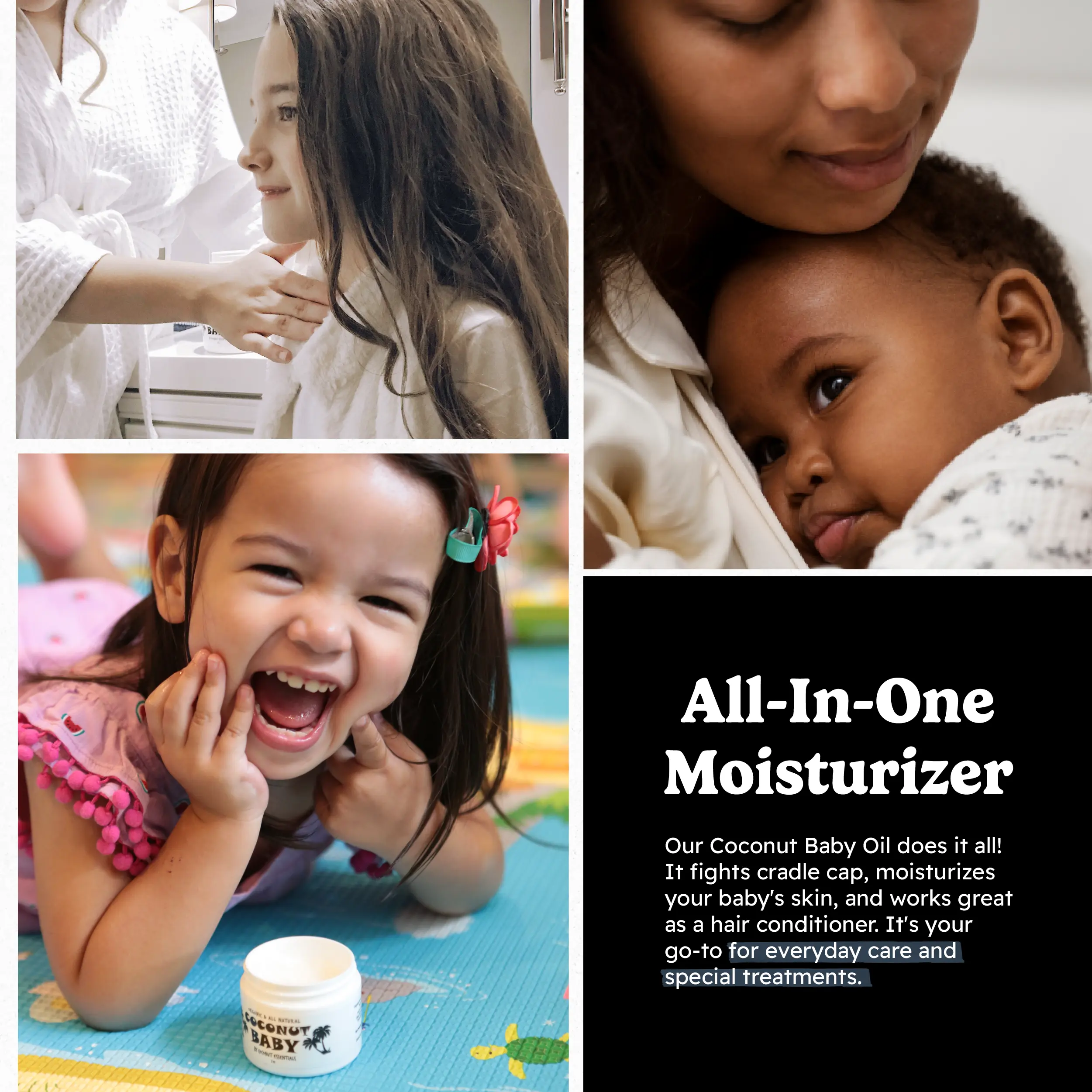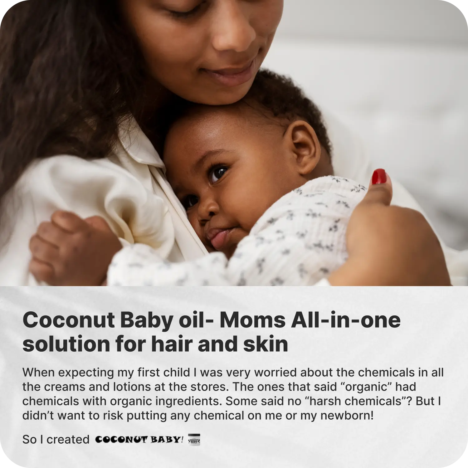 COCONUT BABY Oil is a Mom's all-natural moisturizer great for both hair and skin. Created by a Mom with sensitive skin, this organic baby oil is perfect for newborns, infants, toddlers, Mom, Dad and the entire family.