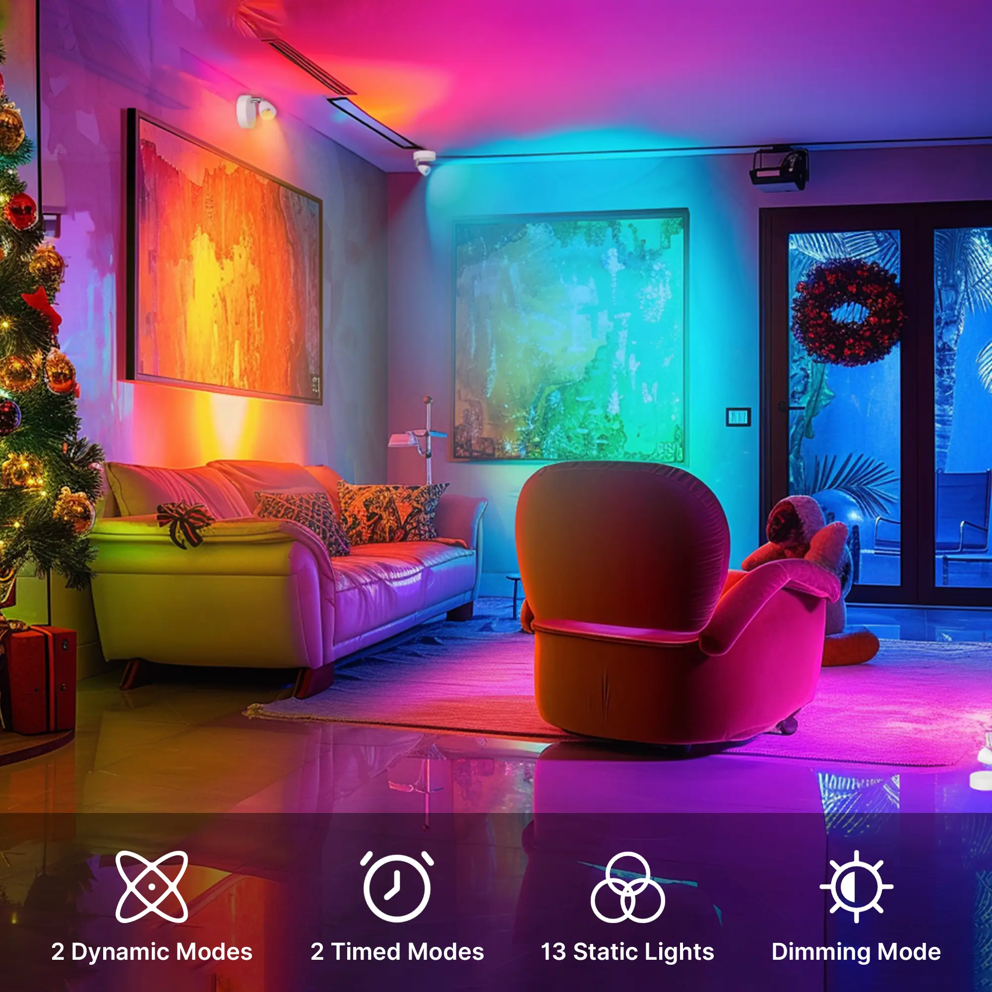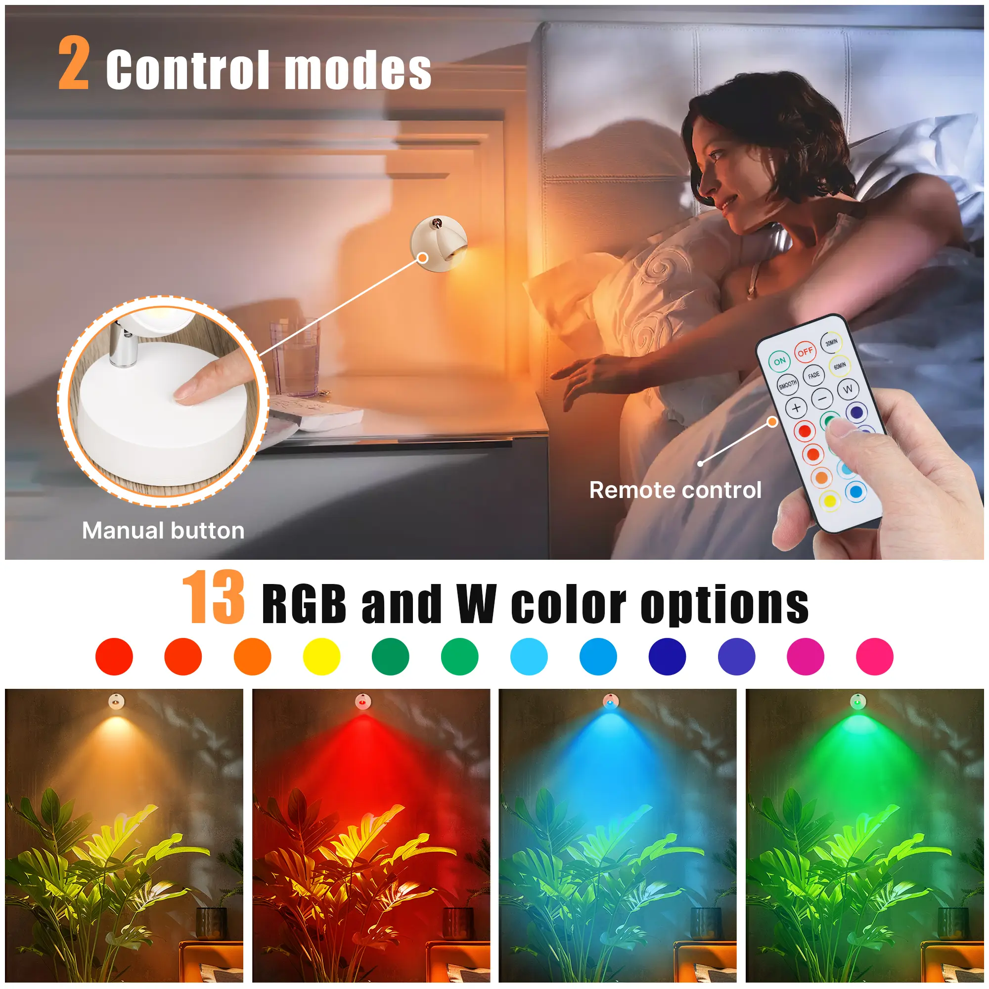 RGB: Easily switch between various colors, whether controlled by buttons or remote control. The remote control further adds convenience with timer presets (15/30/60/120 minutes) and dimming options (50% or 100% brightness, + to increase brightness, - to decrease brightness).
