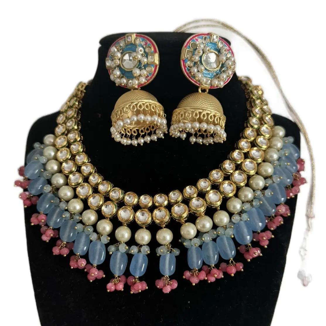 This necklace is a high-quality piece of jewelry that is made of kundan, a material known for its durability and long-lasting quality. The necklace features blue beads that add a pop of color to the design and make it stand out. The blue beads are a unique and eye-catching addition to the necklace, making it a great choice for those who want to add a touch of personality to their outfit.