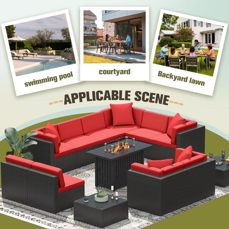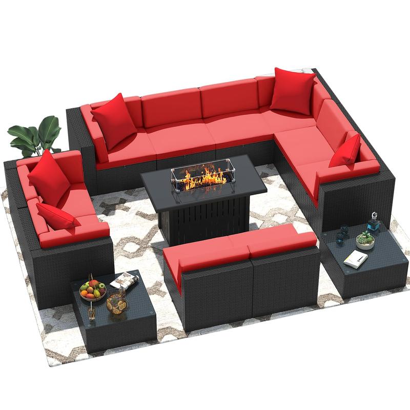 ·Patio furniture set: The 13 piece wicker patio furniture set is easy to set up and made from high quality synthetic handmade rattan. The set includes 5 Armless sofa, 5 corner sofas, 1 fire pit table, and 2 tempered glass coffee tables. And all the necessary tools and detailed instructions are in the box.
