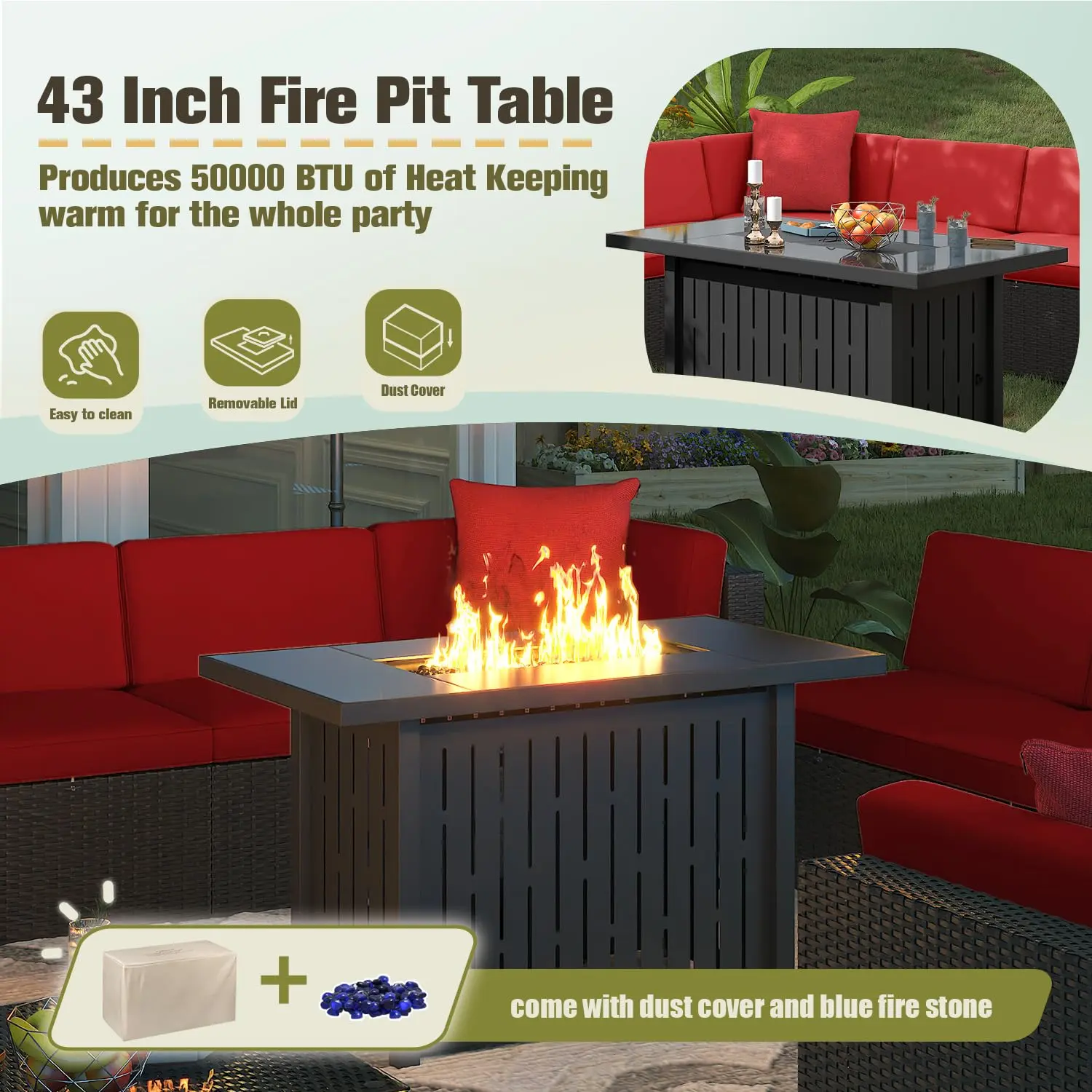 ·43 in fire pit: the patio propane fire pit is CSA certified and meets all electrical requirements to ensure reliability and safety. Equipped with a high efficiency burner, integrated push-button ignition, easy start and flame height adjustment and heat up to 50,000 BTU's. Our gas fire pit table has a widened table top and is designed with a fire pit centre cap for use as an outdoor dining table or coffee table.